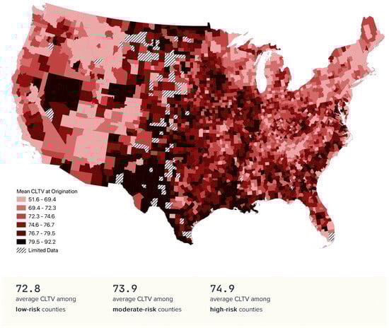 Mean Combined Loan-to-Value by County, 2024. Source: (), HMDAVision.