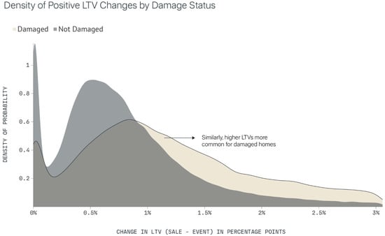 Density of Positive LTV Changes by Foreclosure Outcome and Damage Status. Source: First Street analysis from Lightbox Transaction and Foreclosure Records.