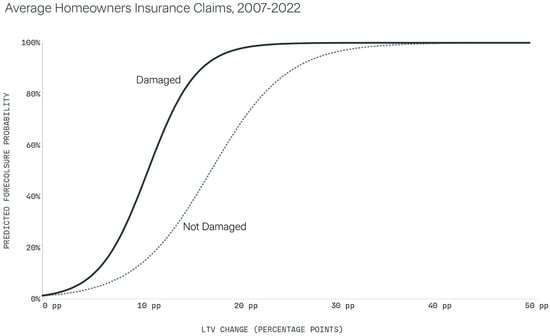 where for damaged properties. Figure 7 plots the implied foreclosure probability against , holding at its median. The two lines correspond to undamaged properties () and damaged properties , with the latter disoplaying a steeper slope. This indicates that the sensitivity of foreclosure risk to rising LTV is considerably stronger for damaged homes, consistent with the intuition that physical impacts compound financial fragility.