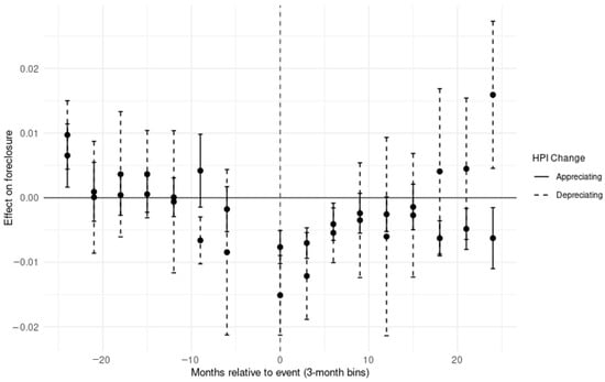 Aggregating across all events underscores the equity channel. Properties that appreciated between sale and disaster saw post-event foreclosures fall 20.0 percent; those that depreciated experienced a 9.1 percent increase (Figure 5). Hurricanes drive much of the contrast (−21.0 percent vs. +8.4 percent), whereas riverine floods raise foreclosure counts in both appreciating and depreciating markets, suggesting that inland households face lower flood insurance penetration and slower claim settlements regardless of price momentum.