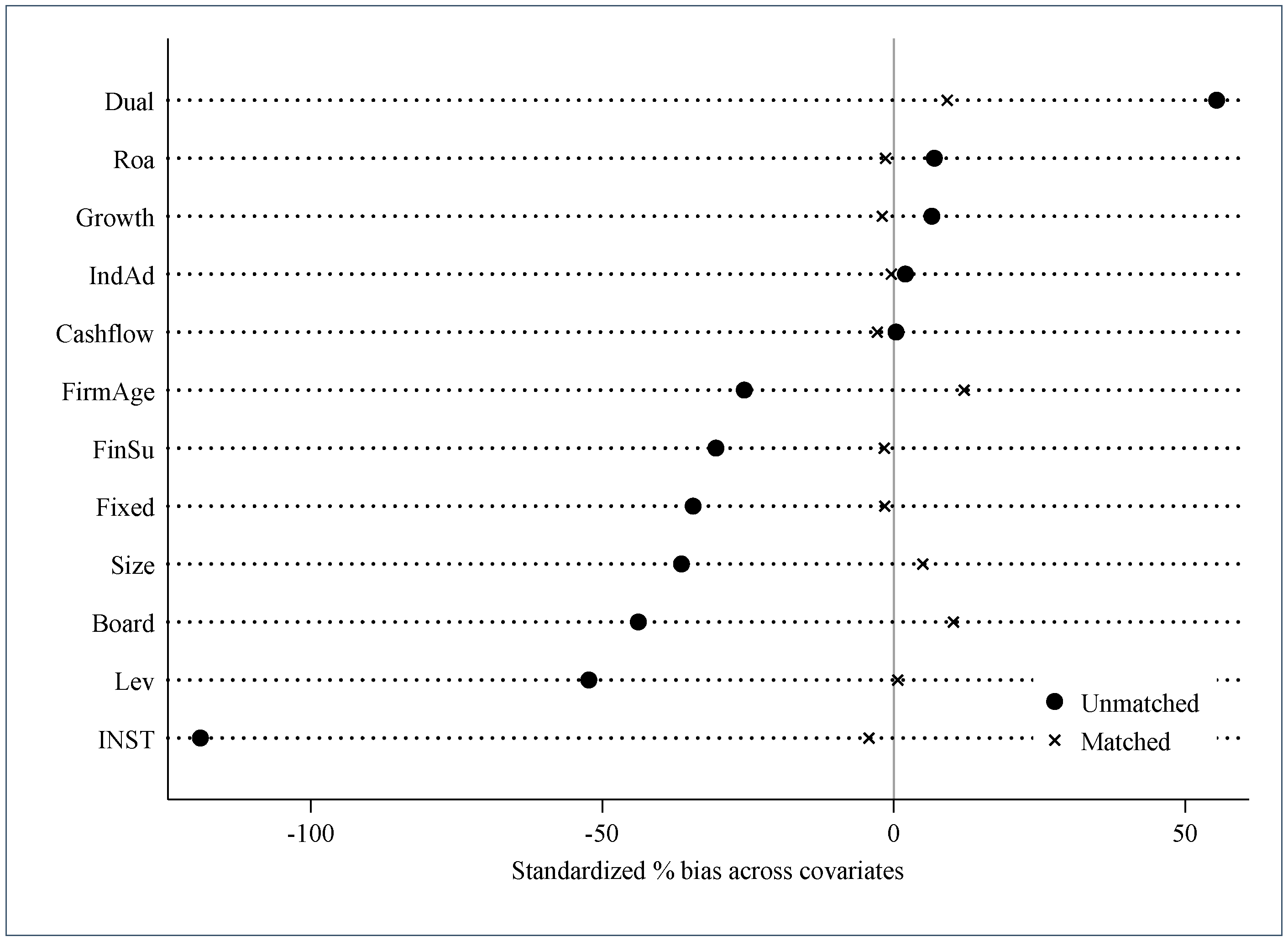 This study adopted the propensity score-matching method to address the bias caused by non-random selection. Specifically, This study employs the criterion of whether executive equity incentive levels surpass the highest point of an inverted U-shaped relationship. Organizations with incentive levels exceeding this threshold are classified as the experimental group, while the remaining sample functions as the control group. Thereafter, all control variables from Model (2) are regarded as covariates, and a 1:1 closest neighbor matching with replacement is performed. The results of the matching matches are shown in Figure 1.