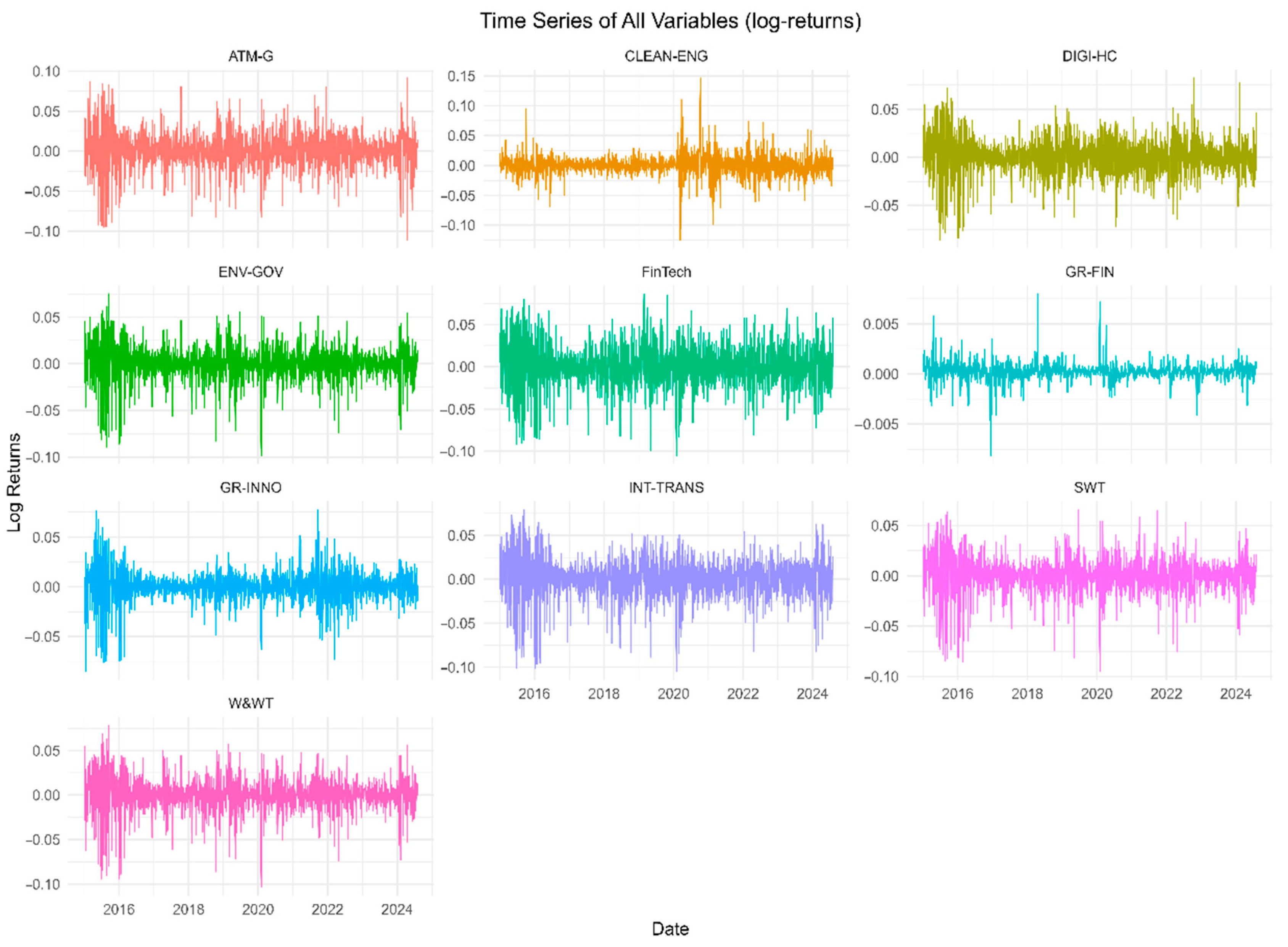 Anchored in this literature, we study daily Chinese stocks and bonds (January 2015–July 2024) spanning ten sustainability-linked sectors: FinTech, green finance, clean energy, green innovations, environmental governance (including atmospheric quality), water and water treatment, solid waste treatment, intelligent transportation, and digital healthcare. This broad yet policy-coherent system is theoretically connected by funding/liquidity channels (FinTech platforms, green credit/bond markets), regulatory spillovers (carbon/ESG rules, environmental governance), and technology/real-economy links (digital healthcare and transport platforms relying on financing and data rails). Modeling these sectors jointly allows us to: (i) assess whether FinTech behaves as a net transmitter of shocks to sustainability verticals in stress states (funding channel), (ii) evaluate policy-intensive nodes (e.g., environmental governance proxies) as state-dependent transmitters/absorbers, and (iii) gauge whether diversification benefits compress in tails when connectedness rises. Recent scholarship has deepened our understanding of green finance and systemic tail-risk transmission.