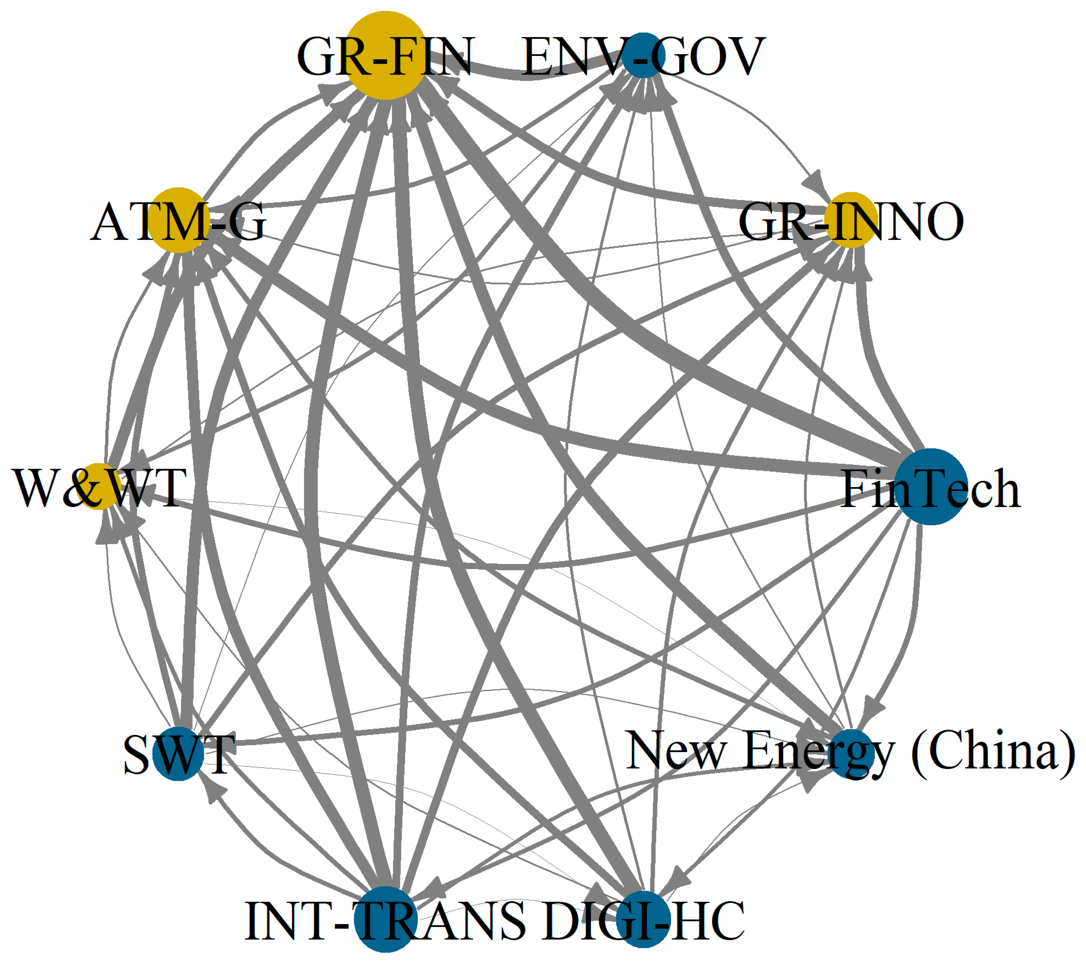 At τ = 0.90 (optimistic state), the network becomes sparser and two-way interactions dominate. FinTech’s transmitter role weakens, while digital verticals such as healthcare and intelligent transport take on more active positions. This supports H3, where technology-driven sectors partially transmit shocks in positive states, driven by demand rebounds and platform growth.