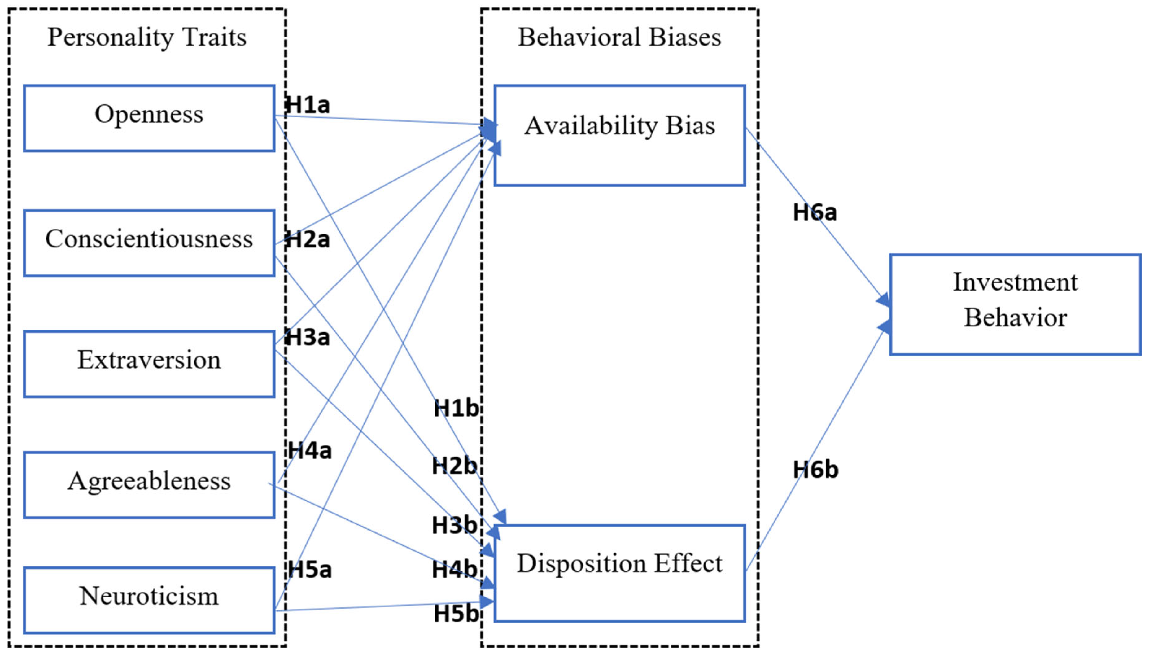 The model consisted of ten direct hypotheses connecting each of the five personality traits to the two behavioral biases (