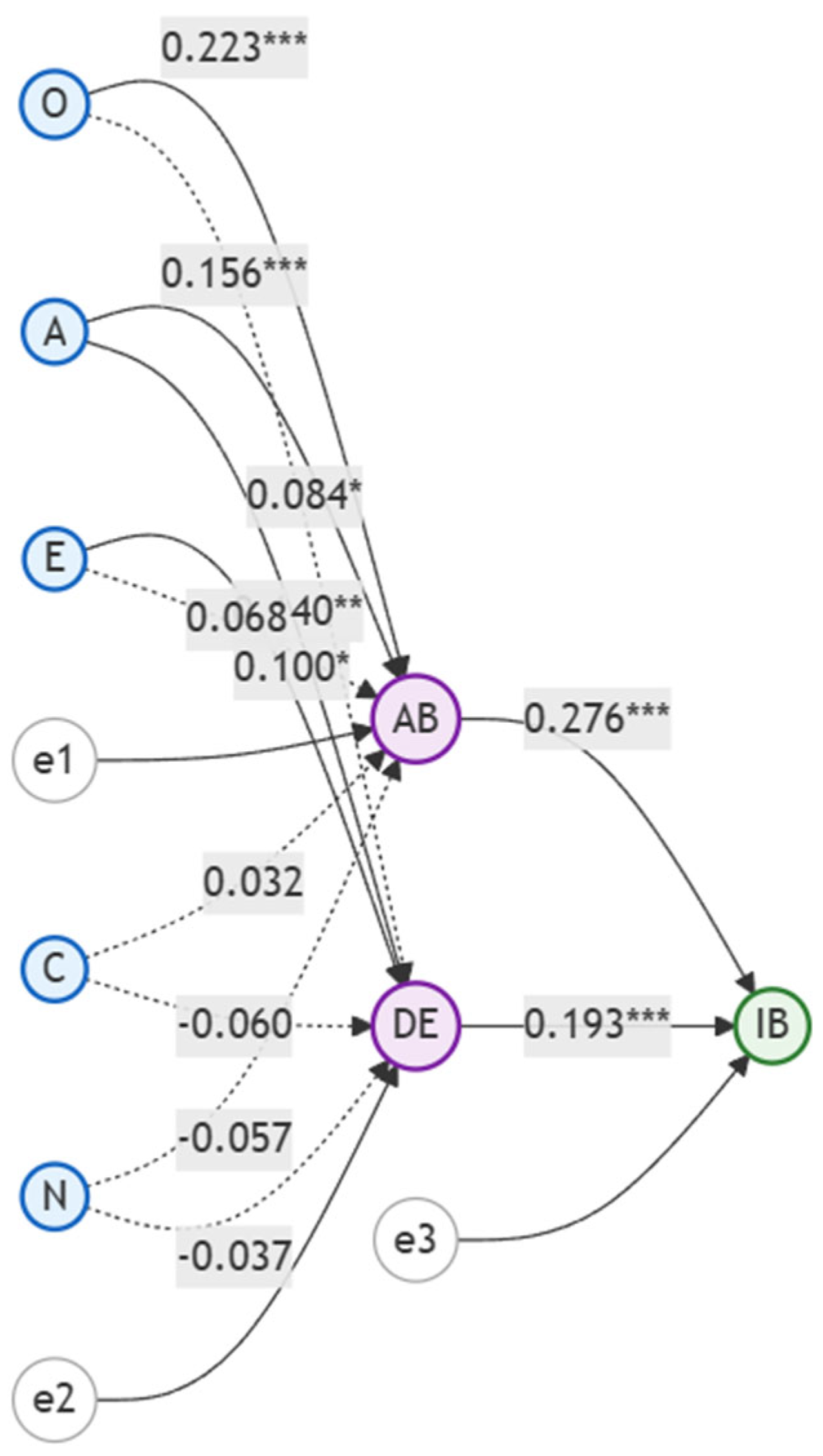 p < 0.05). In other words, people’s investment decisions are heavily influenced by these psychological biases rather than being directly influenced by their personalities. This pattern of findings supports the causal relationship we previously outlined: investors’ financial decisions are influenced by their biased cognitive processes, which are shaped by their personality traits. These results provide substantial empirical backing for the theoretical framework presented in