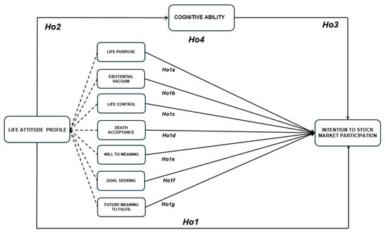 Figure 1 depicts a theoretical model articulating the interplay between life orientations, cognitive aptitude, and the intention to engage in stock-market activity. The central construct is the Life Attitude Profile (LAP), comprising seven interdependent dimensions: life purpose, existential vacuum, life control, acceptance of mortality, will to meaning, goal orientation, and future-orienting meaning. The model postulates that the LAP exerts a direct, unmediated effect on the intention to invest in equity markets. In parallel, cognitive ability is specified as a mediating construct, positing that individuals equipped with elevated cognitive faculties are more proficient in processing financial information, thereby harmonizing personal life orientation with forthcoming investment decisions. The model thus encapsulates the mutual modulation of affectivity and cognitive processing in the shaping of financial comportment.