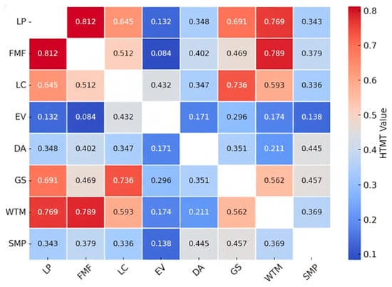 The discriminant validity of the reflective measurement model was examined using the Fornell–Larcker criterion, which stipulates that each construct’s square root of the Average Variance Extracted (AVE) should exceed its highest correlation with any other construct (Fornell & Larcker, 1981). As shown in Table 4, all diagonal entries (square roots of AVEs) are greater than the corresponding off-diagonal correlations, confirming satisfactory discriminant validity among the latent constructs. Specifically, the square roots of the AVE values for all constructs—Life Purpose (LP = 0.826), Future Meaning to Fulfill (FMF = 0.854), Life Control (LC = 0.809), Existential Vacuum (EV = 0.841), Death Acceptance (DC = 0.798), Goal Seeking (GS = 0.833), Will to Meaning (WTM = 0.864), and Intention to Stock Market Participation (SMP = 0.904)—are substantially higher than their inter-construct correlations. This finding indicates that each construct shares more variance with its respective indicators than with other constructs in the model.