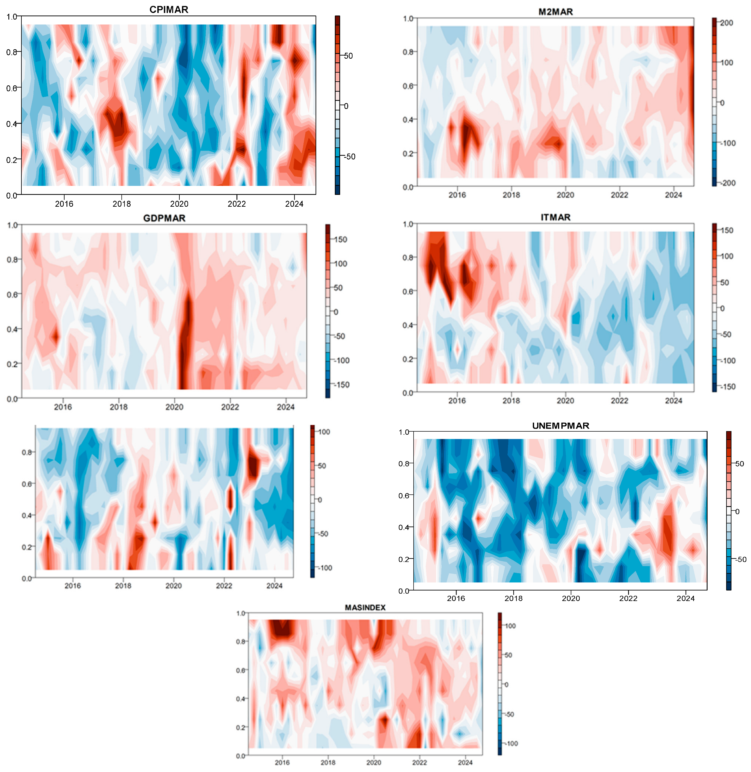 | Kendall | CPIMAR | M2MAR | GDPMAR | ITMAR | MAD.USD | UNEMPMAR | MASINDEX |