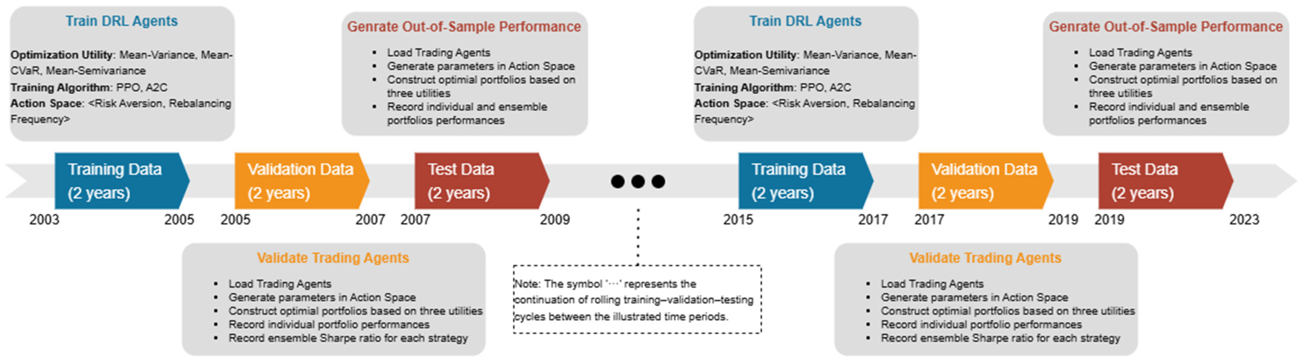 | 3 | The DJIA panel begins in 2005 to ensure continuous histories for all 28 retained names. With a 252-day feature look-back and rolling two-year train–validate–test design, the first ETF out-of-sample test begins in January 2007, and the first DJIA test starts in January 2011. |
