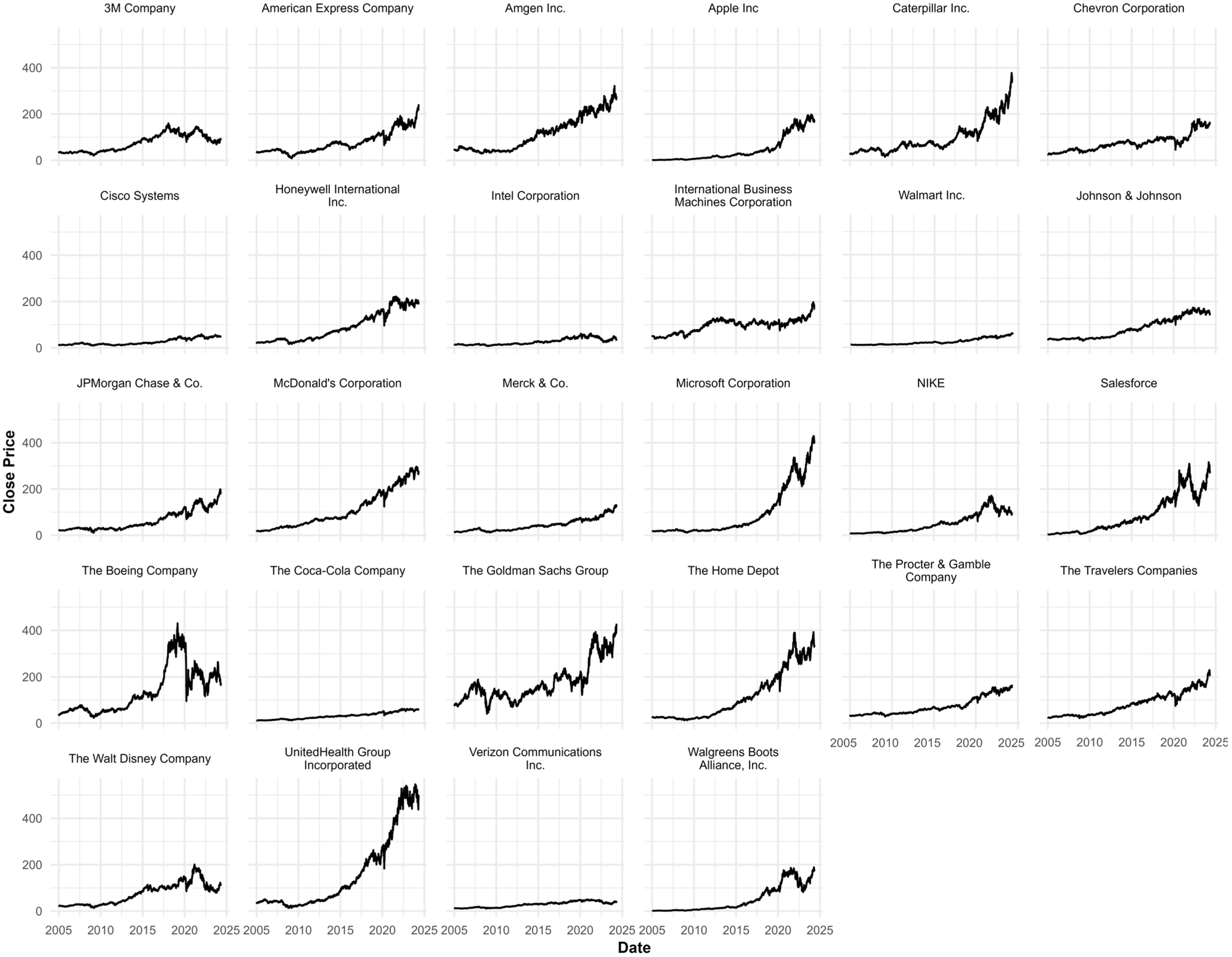 | 2 | Since the DJIA composition changes frequently—for example, Amazon replaced Walgreens Boots Alliance in 2024 and Salesforce, Amgen, and Honeywell joined in 2020—we assume a static universe to keep the analysis consistent across the sample period. |