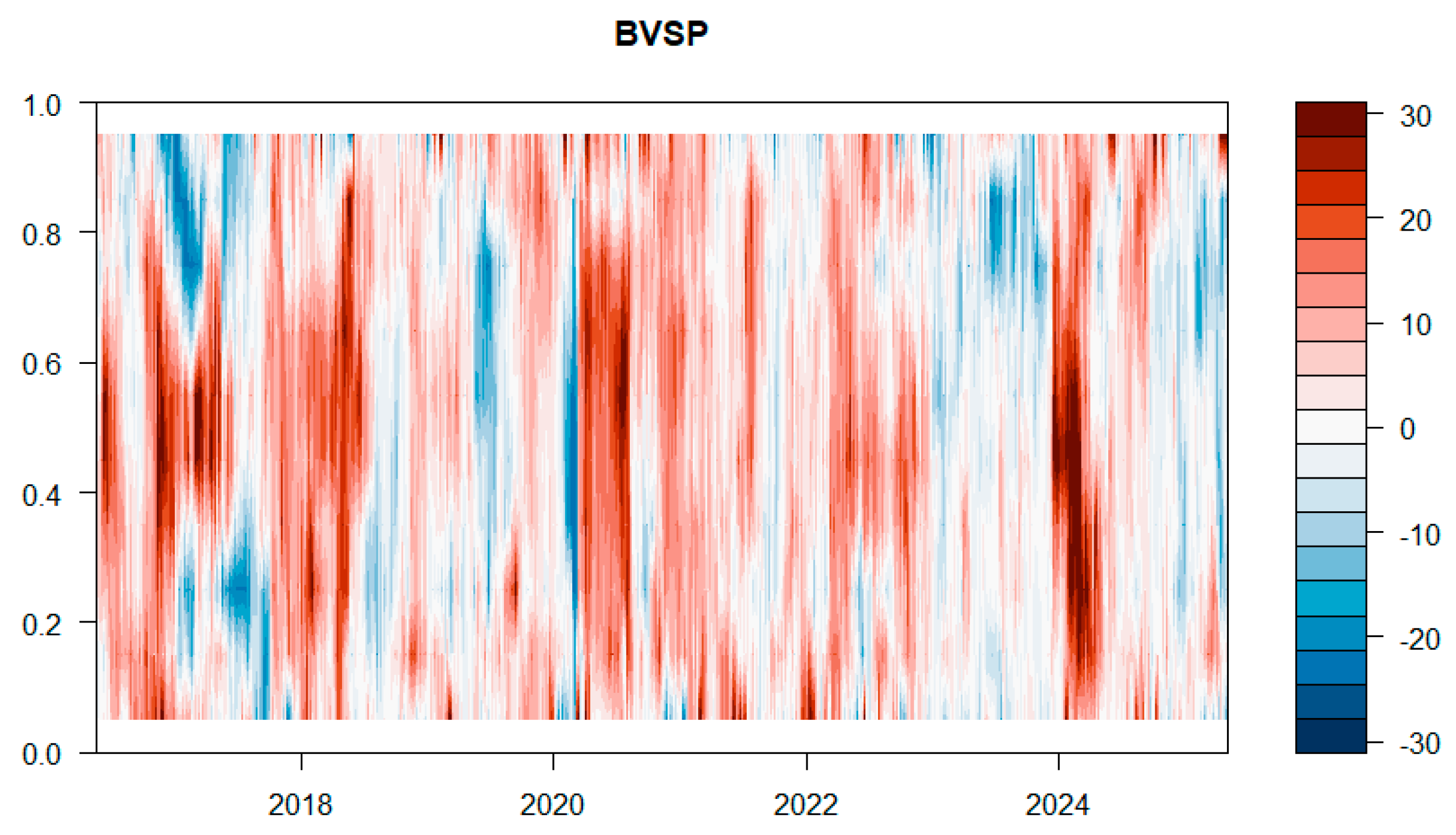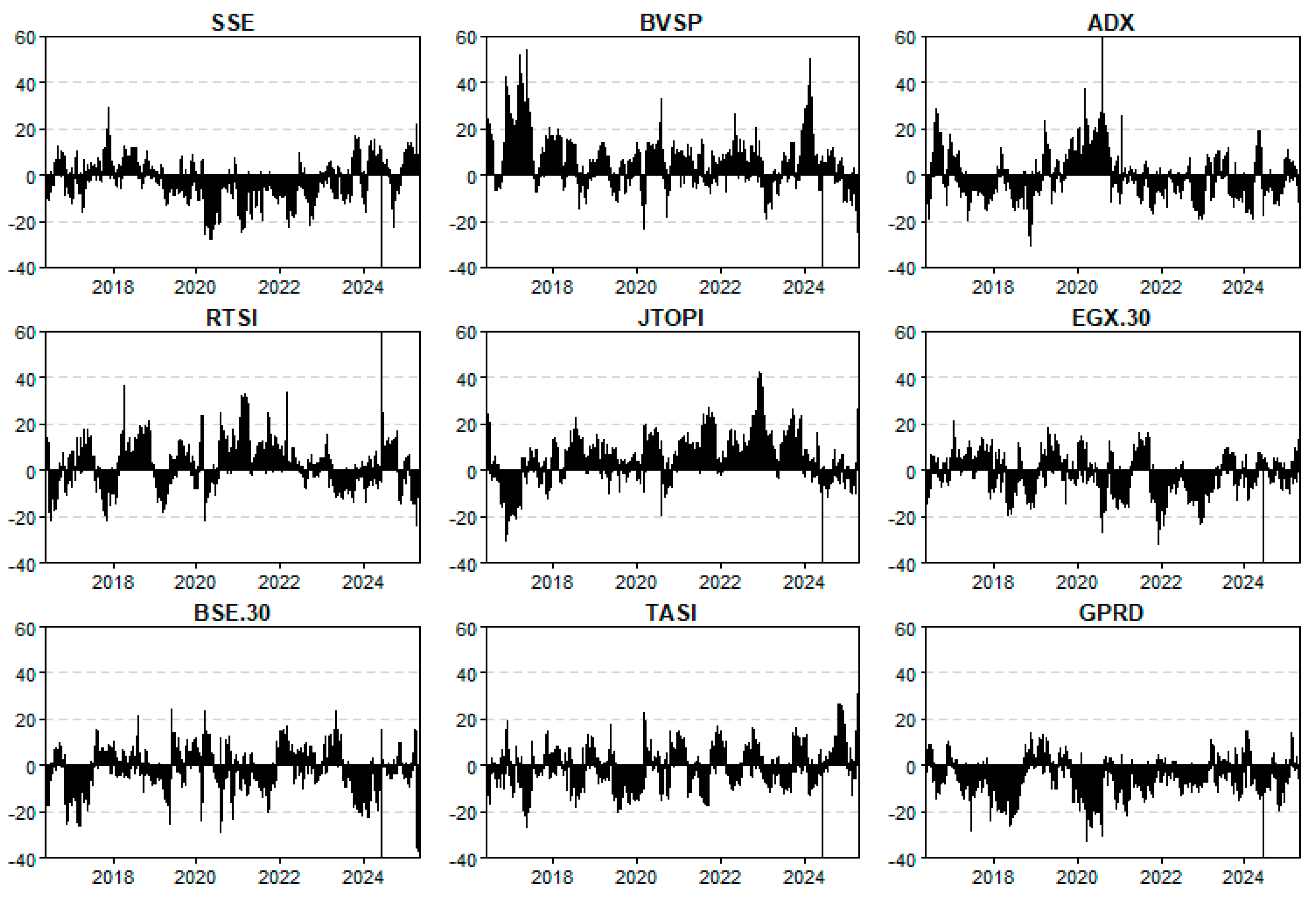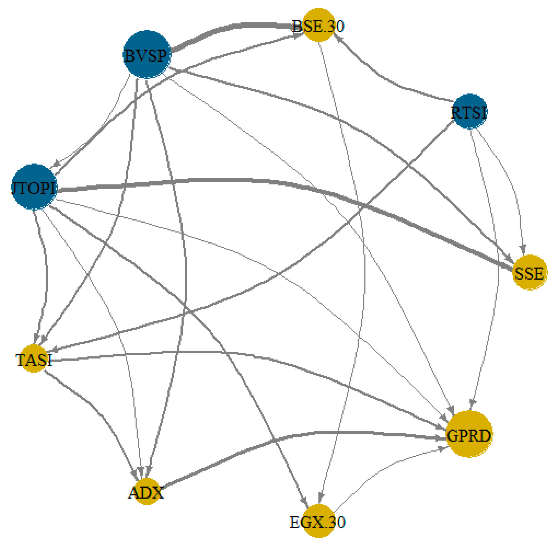 | BVSP | −0.250 * | 0.055 * | 0.147 * | 0.110 * | 1.000 * | 0.173 * | 0.088 * | 0.087 * | 0.031 * | 0.000 |