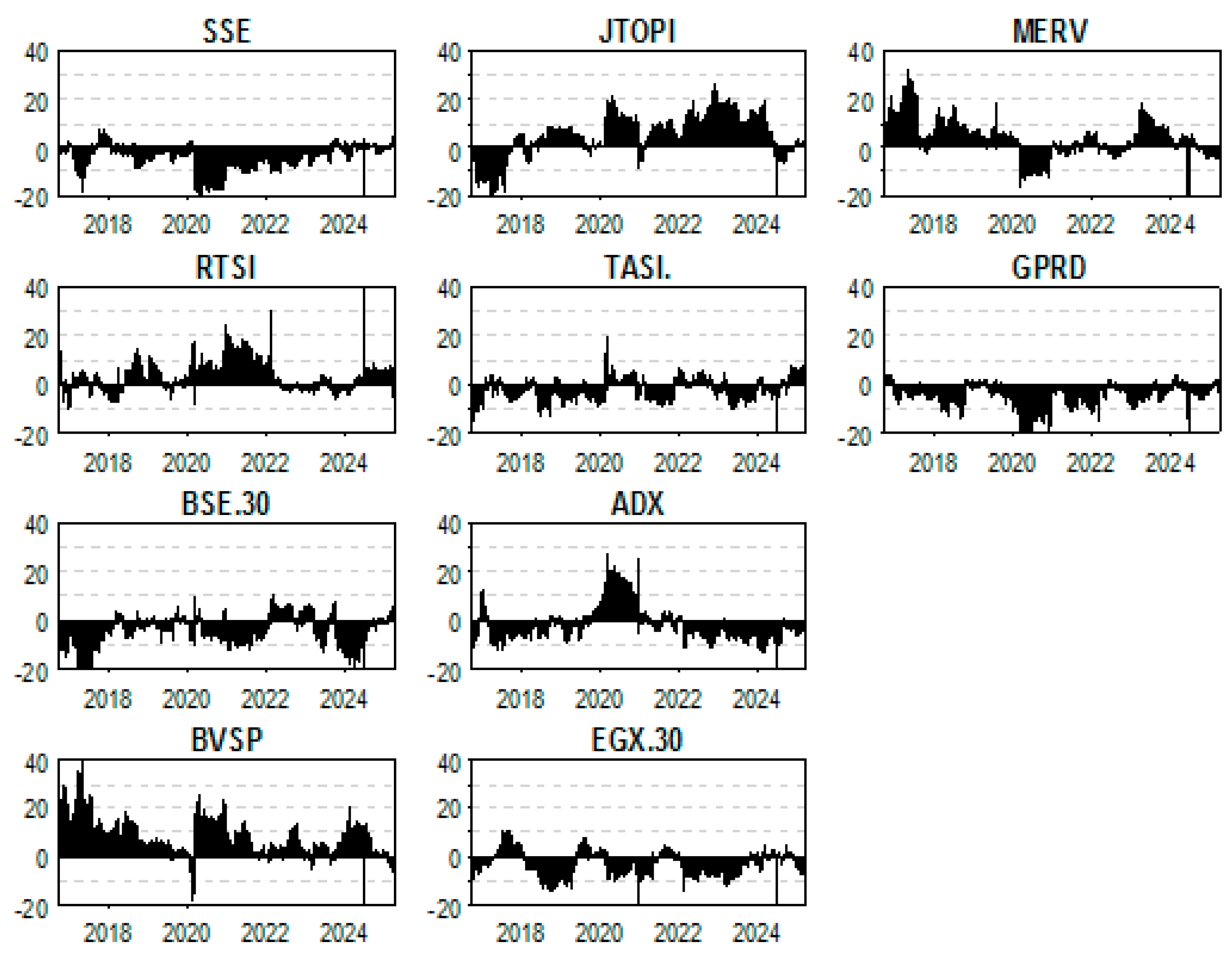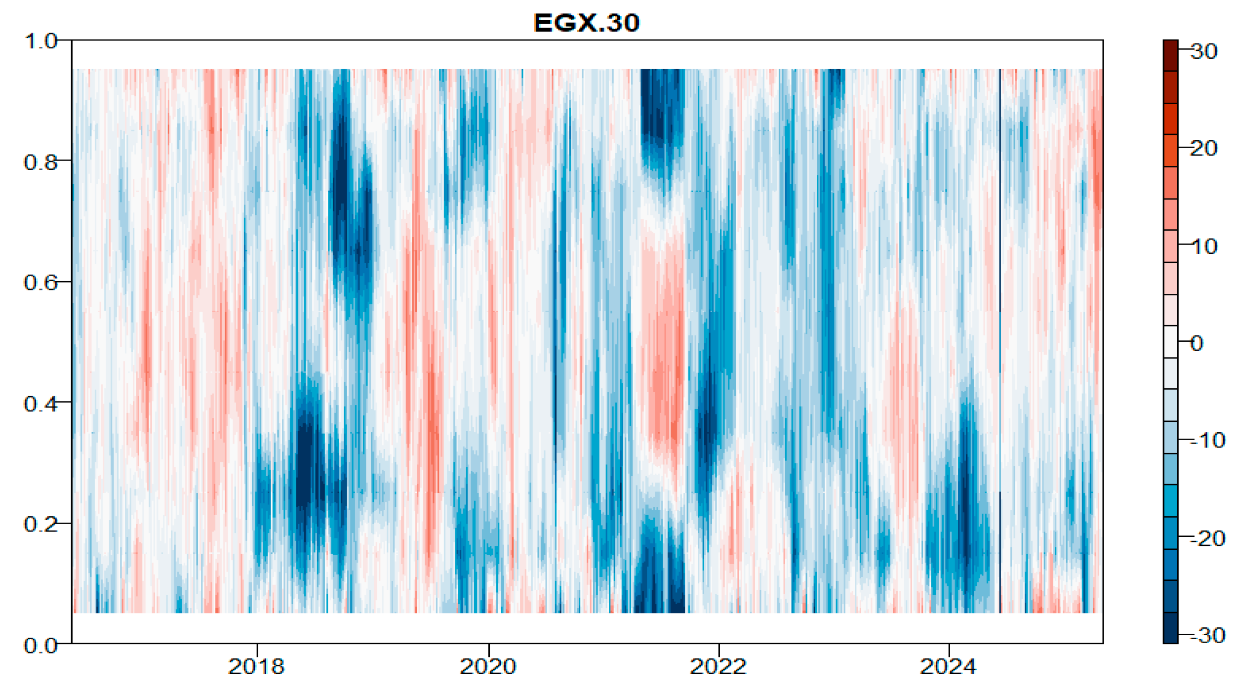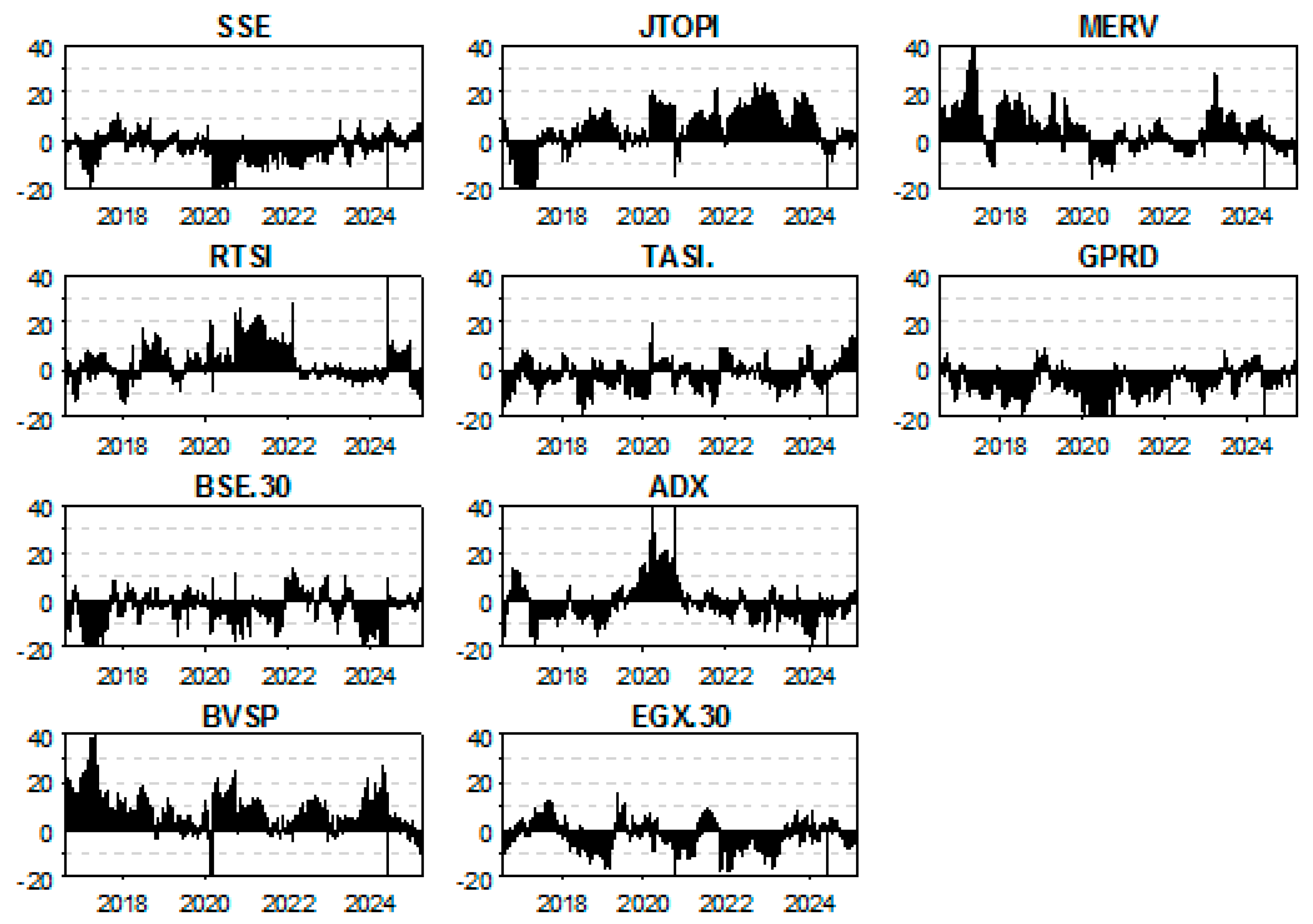 | EGX.30 | −0.053 * | 0.066 * | 0.069 * | 0.091 * | 0.031 ** | 0.088 * | 0.092 * | 0.070 * | 1.000 * | −0.006 |