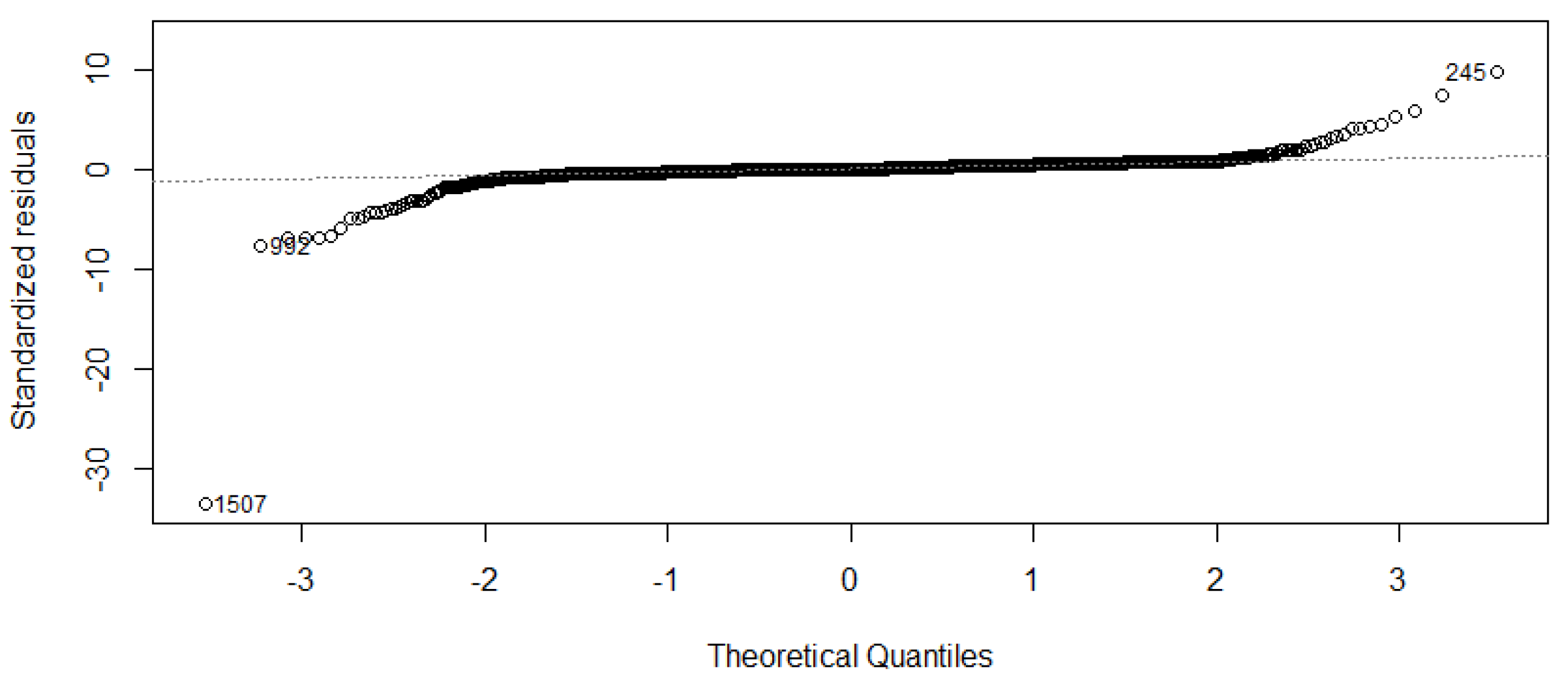 Figure 1 illustrates the standardized residuals from the POLS regression model plotted against the theoretical quantiles of a normal distribution. This diagnostic plot is used to assess whether the residuals approximately follow a normal distribution. The plot indicates that the residuals are approximately normally distributed, as most points align closely with the theoretical quantile line. Minor deviations in the tails suggest the presence of outliers.