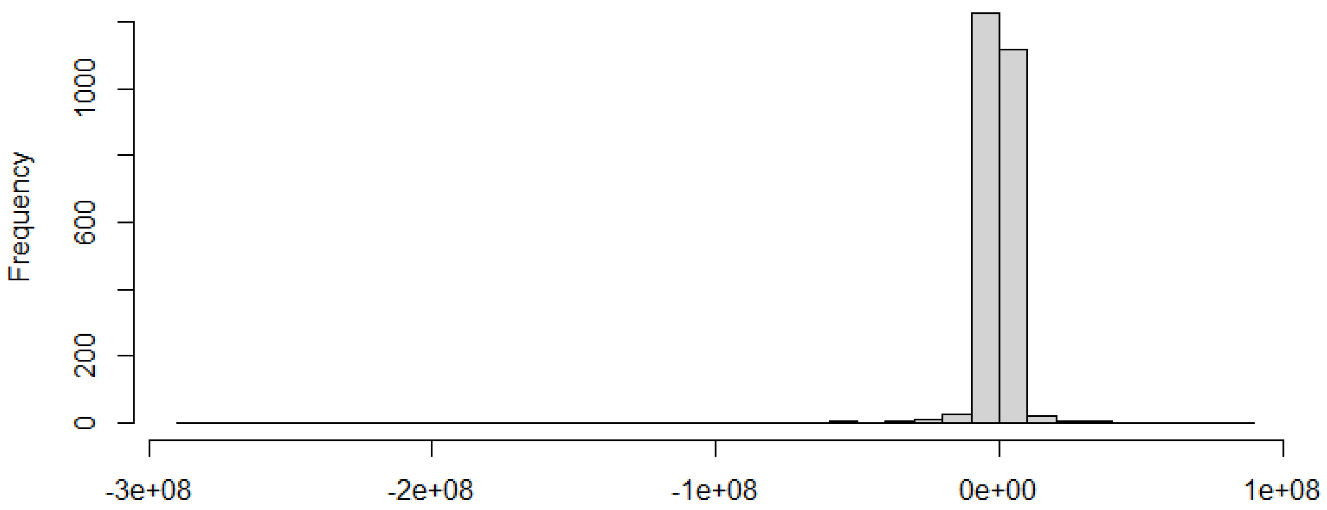 Figure 2 displays the distribution of residuals from the POLS regression model. This diagnostic plot is useful for evaluating the normality assumption of the residuals. The histogram of residuals indicates that the majority of residuals are concentrated around zero, consistent with an unbiased model fit. However, the presence of extreme residuals introduces asymmetry in the distribution.