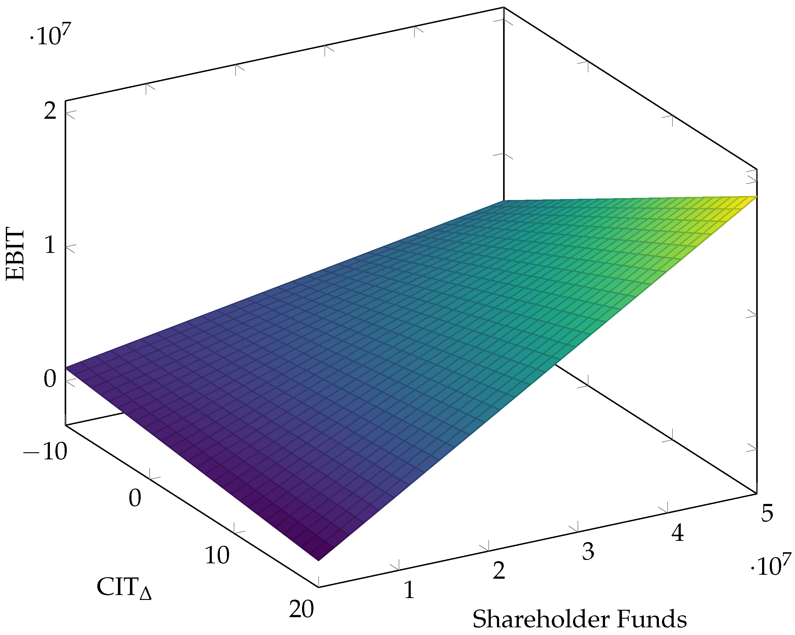 Third, the interaction term between the CIT differential and shareholder’ funds is positive and statistically significant. We plot a 3D surface to visualize the moderation effect. The plot (