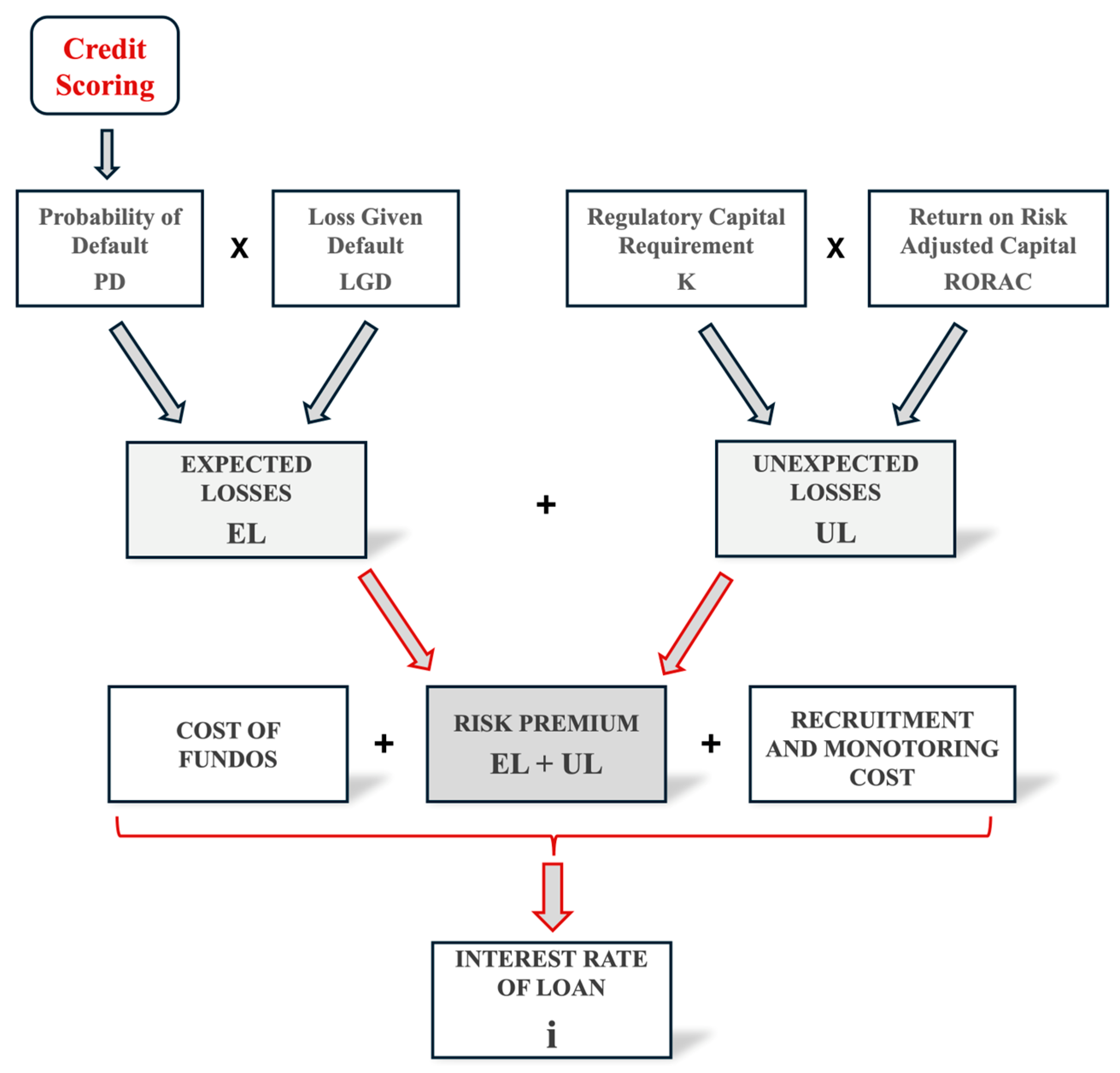 First, the probability of default (PD), estimated using statistical or artificial intelligence models, is used to calculate the expected loss (EL = PD × LGD × EAD). Subsequently, the unexpected loss (UL) is obtained as a function of the regulatory capital requirement (K), determined by the Internal Ratings-Based (IRB) approach.
