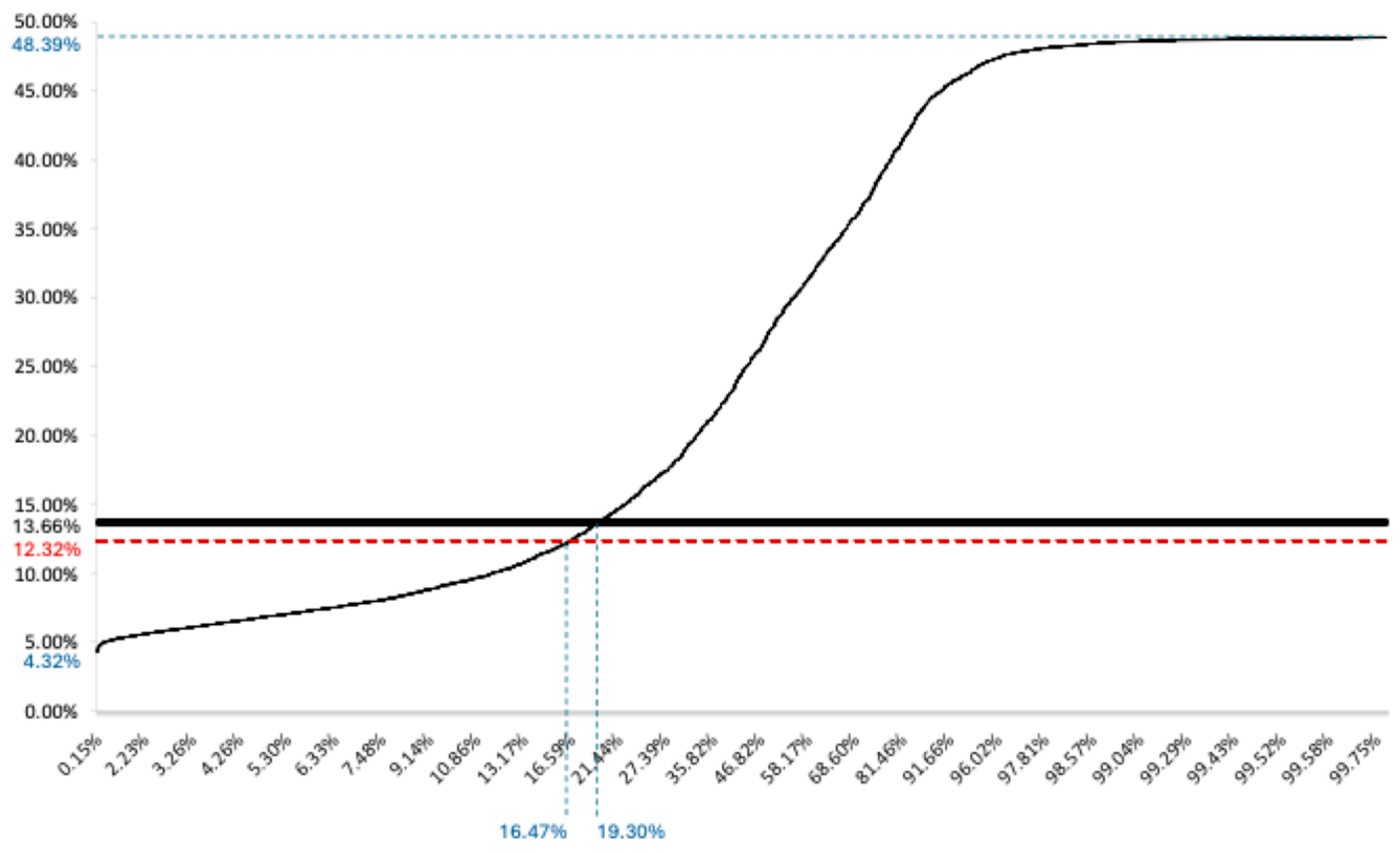 Figure 2. It shows that the real annual interest rate applied by the MFI is associated with an average PD of 16.47%. Also, under the IRB-MLP approach, the interest rates applied by the MFI should vary between 4.32% and 48.89%, depending on the estimated probability of default (PD) for each customer. In contrast, the standardised approach would maintain a fixed interest rate of 13.66%, regardless of the borrower’s risk level.