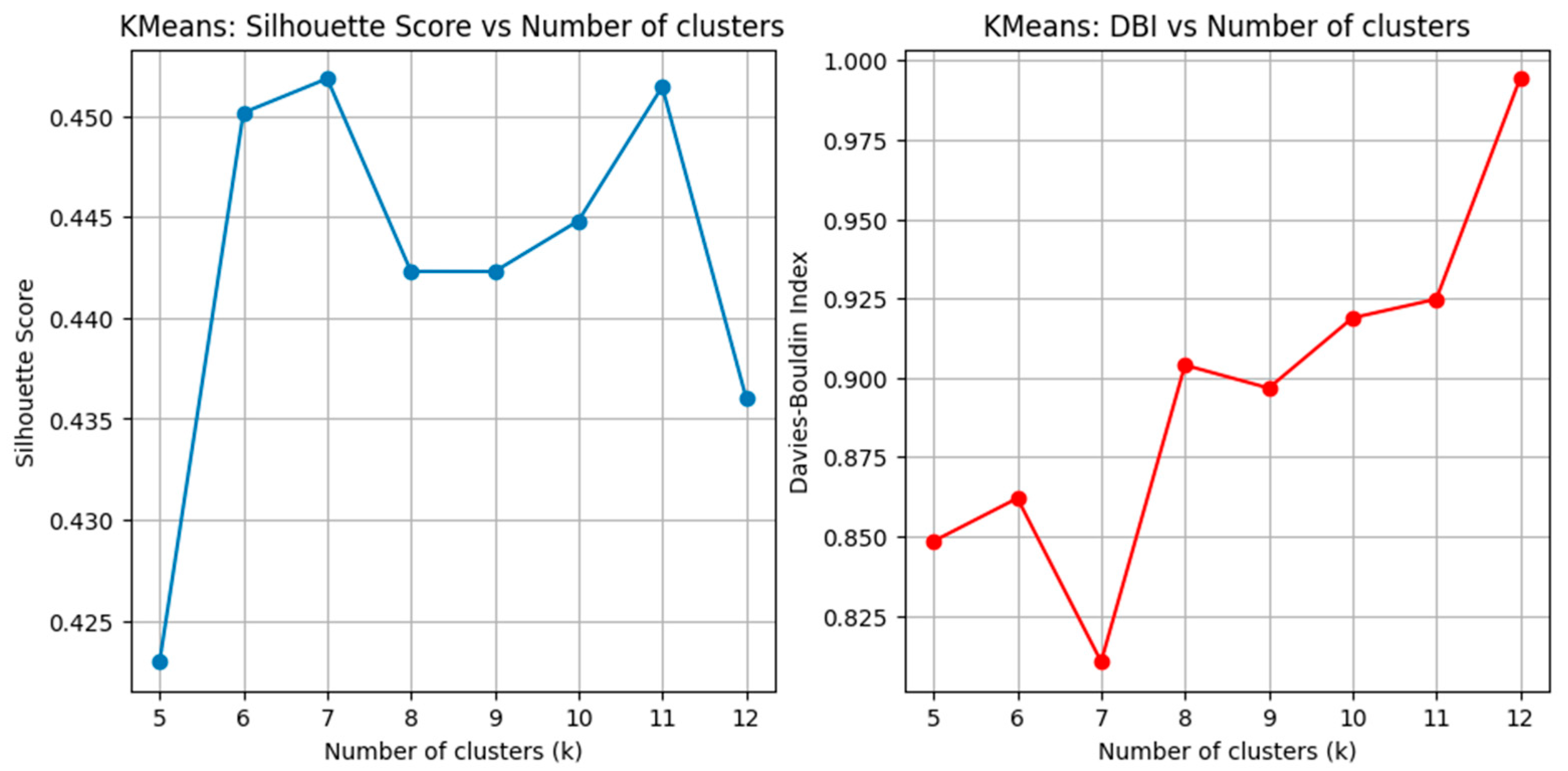 Figure 2). The lowest DBI is observed at k = 7 (DBI = 0.810), indicating reduced similarity between clusters and strong inter-cluster separation. In contrast, smaller or larger numbers of clusters lead to higher DBI values, such as 0.848 at k = 5 and 0.994 at k = 12, which reflect less efficient separation.