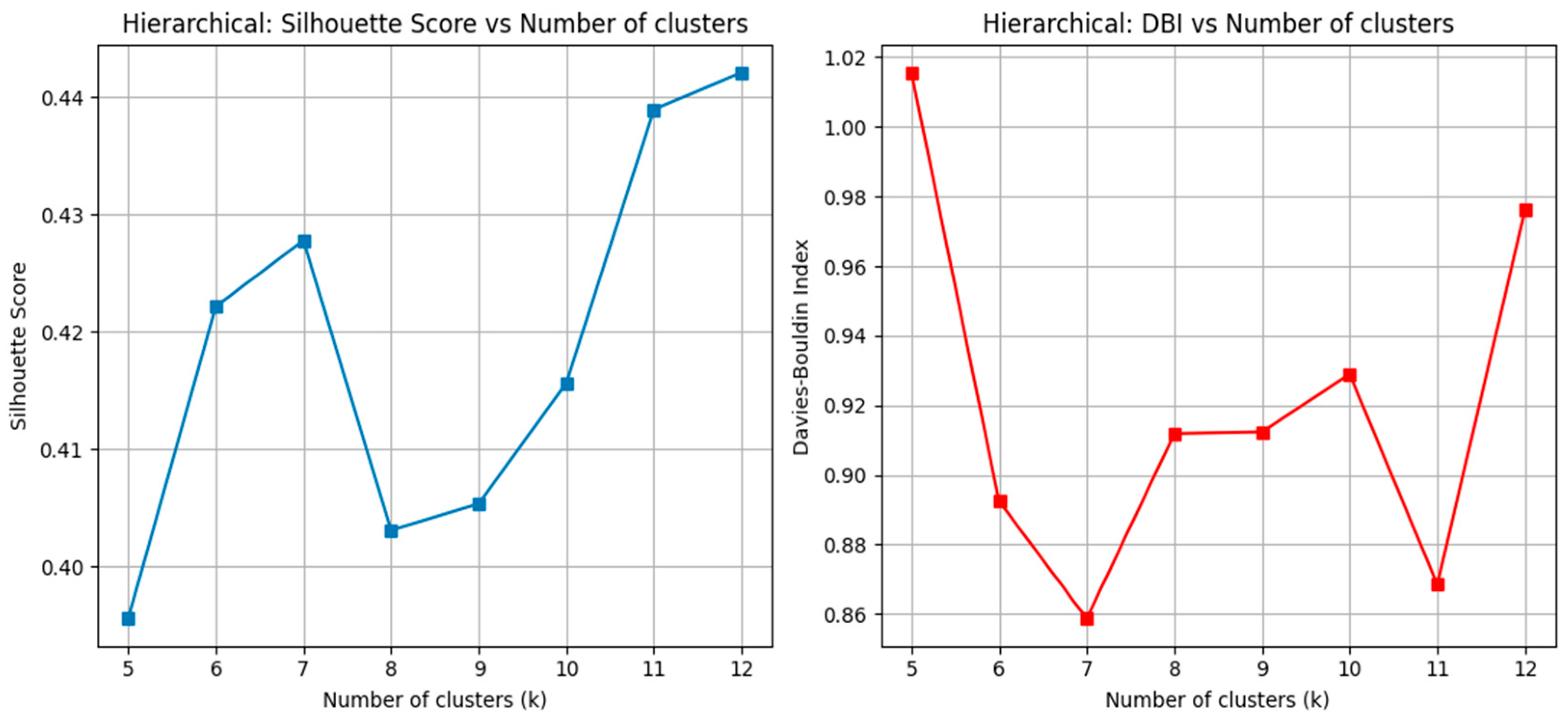 Hierarchical agglomerative clustering with Ward’s linkage is applied to the same dataset, with the number of clusters varied between k = 5 and k = 12. The evaluation follows the same two internal measures: The Silhouette Score and the DBI (
