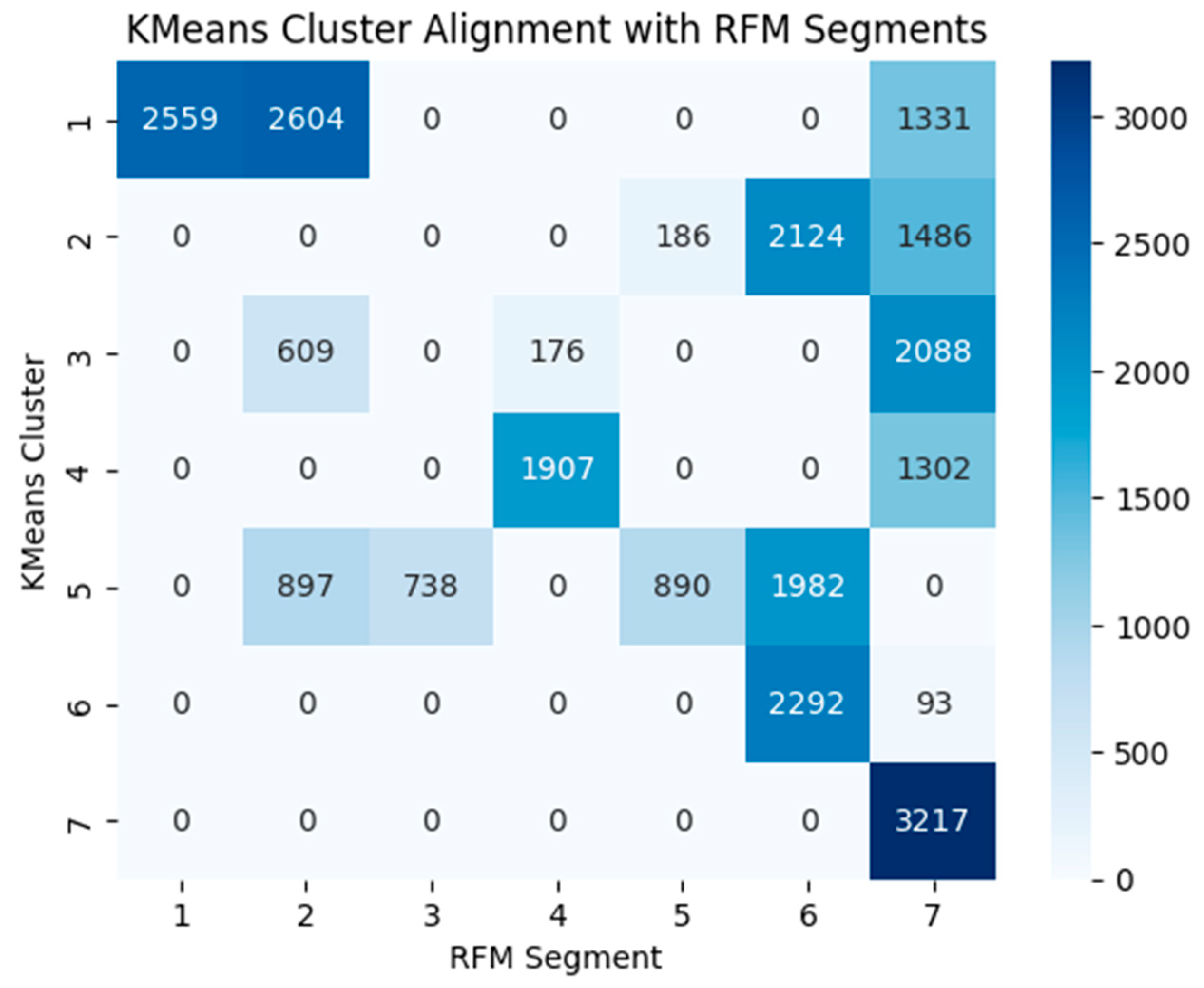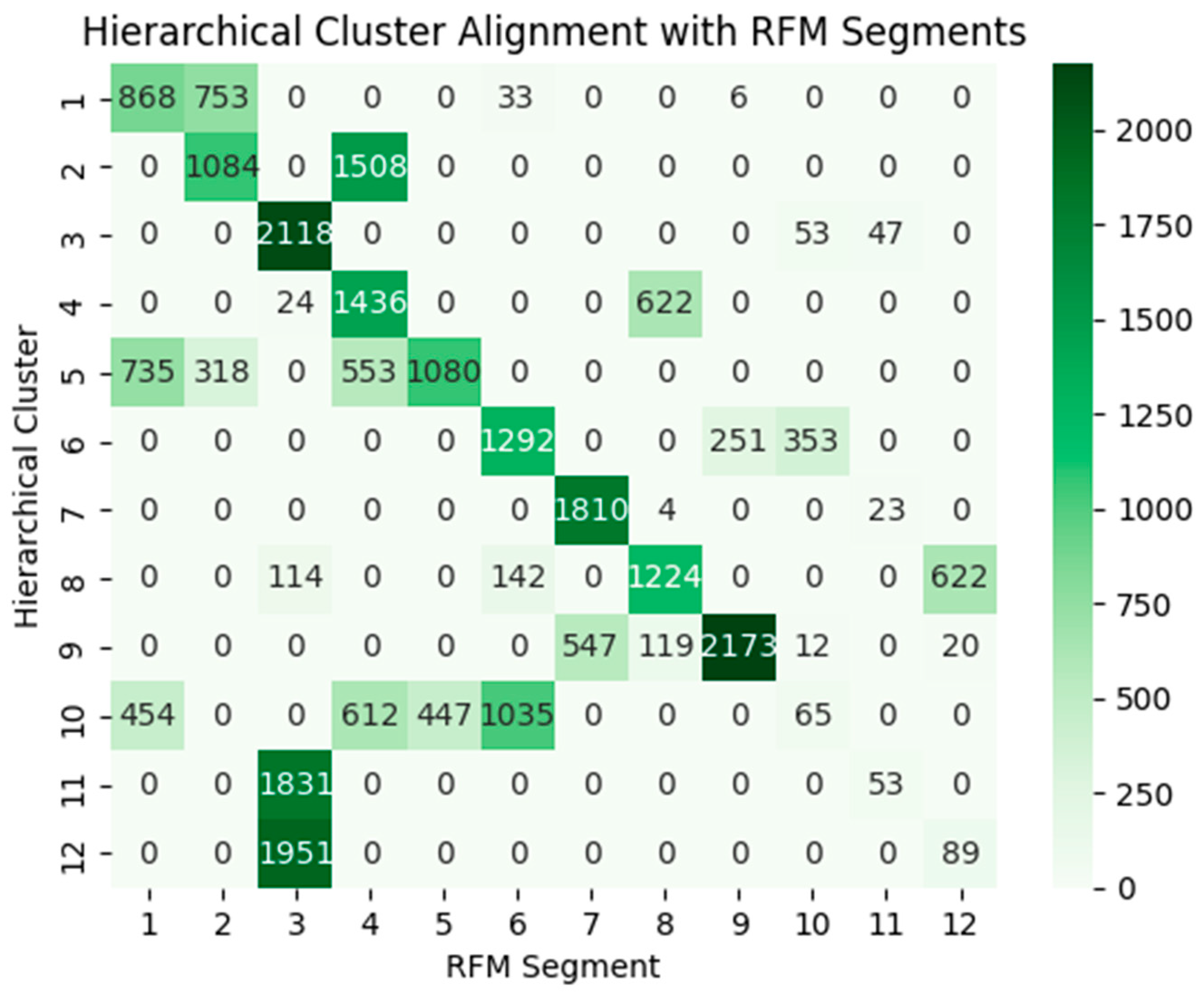 The heatmaps provide visual evidence of the structural differences between the clustering approaches. In the KMeans solution, the absence of a strong diagonal pattern reveals that several RFM categories are distributed across multiple clusters, and conversely, individual KMeans clusters contain mixtures of different RFM groups. This dispersion suggests that KMeans identifies partitions that do not closely reflect the behavioral boundaries implied by RFM scoring, thereby limiting interpretability. In contrast, the hierarchical clustering heatmap exhibits distinct, high-density diagonal blocks, indicating that each hierarchical cluster aligns predominantly with a single RFM segment. This structure highlights two key properties of the hierarchical solution: (1) clusters are behaviorally coherent and internally consistent, and (2) the segmentation granularity at k = 12 captures meaningful distinctions that are both data-driven and interpretable. The emergence of these well-defined block structures provides strong visual support for selecting 12 clusters in the hierarchical framework and complements the quantitative validity and alignment metrics reported earlier.