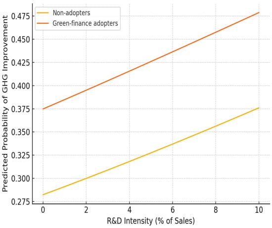 Predicted probability of GHG improvement by R&D intensity and finance adoption. (see embedded figure in electronic article).