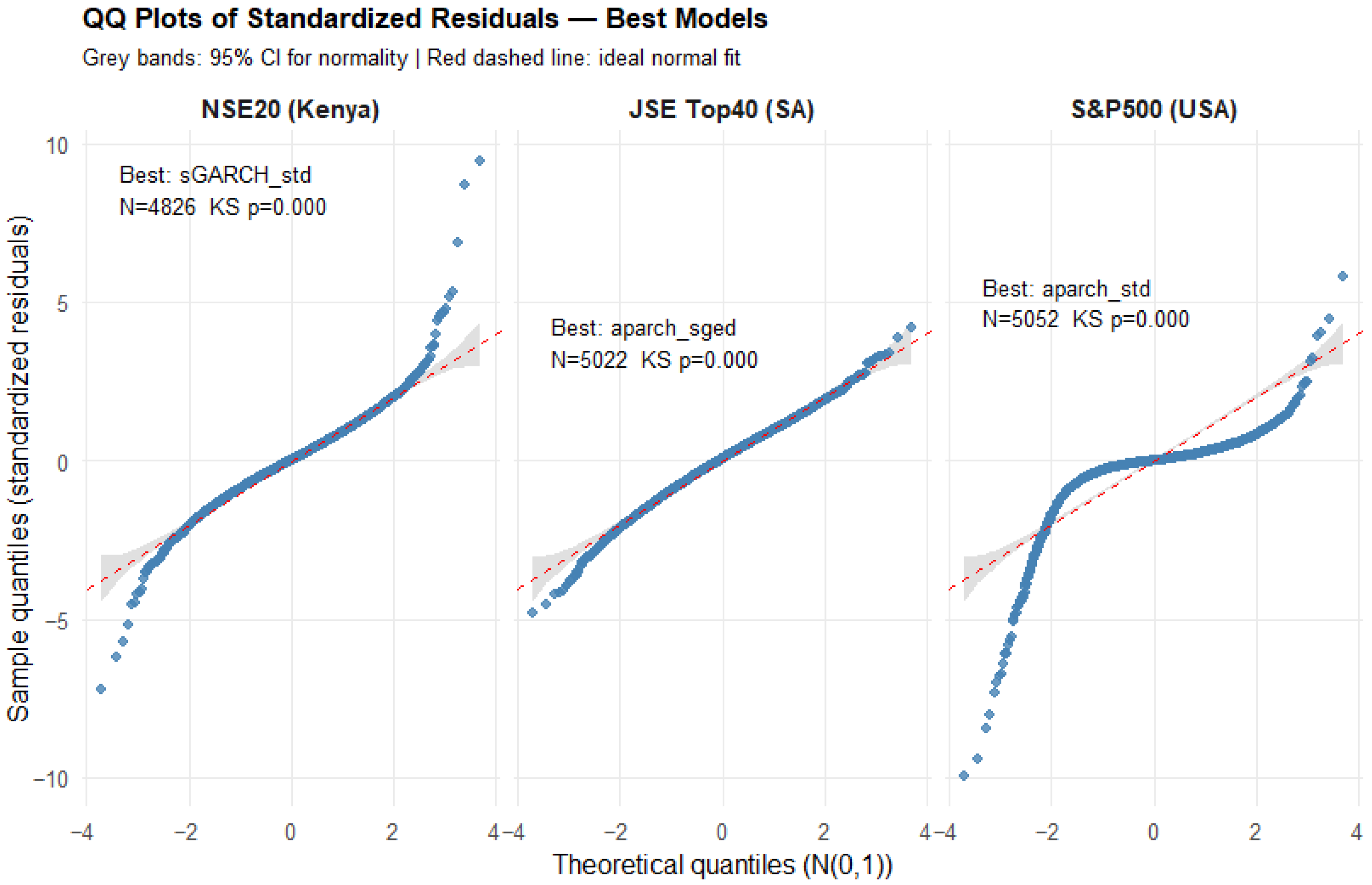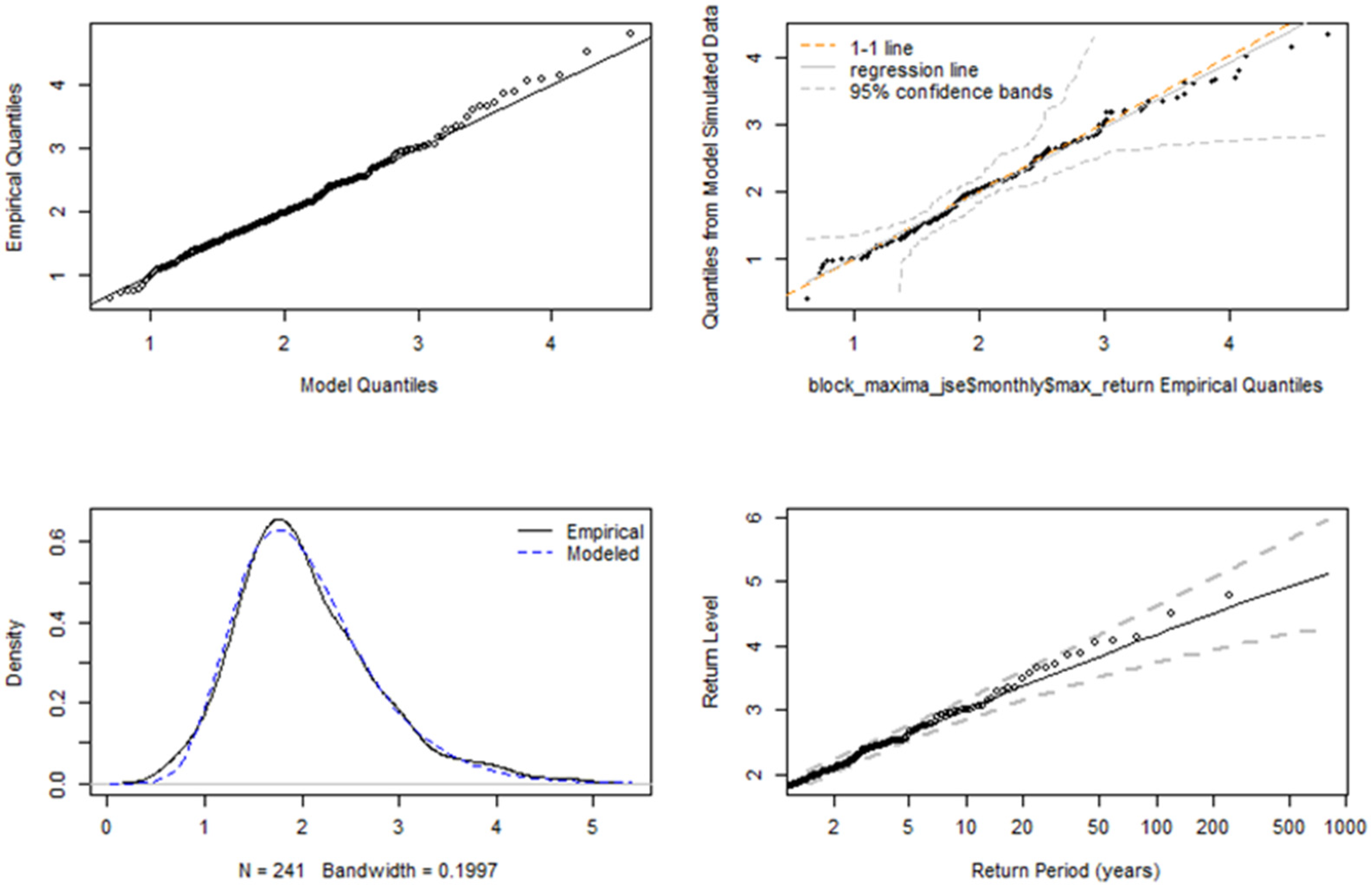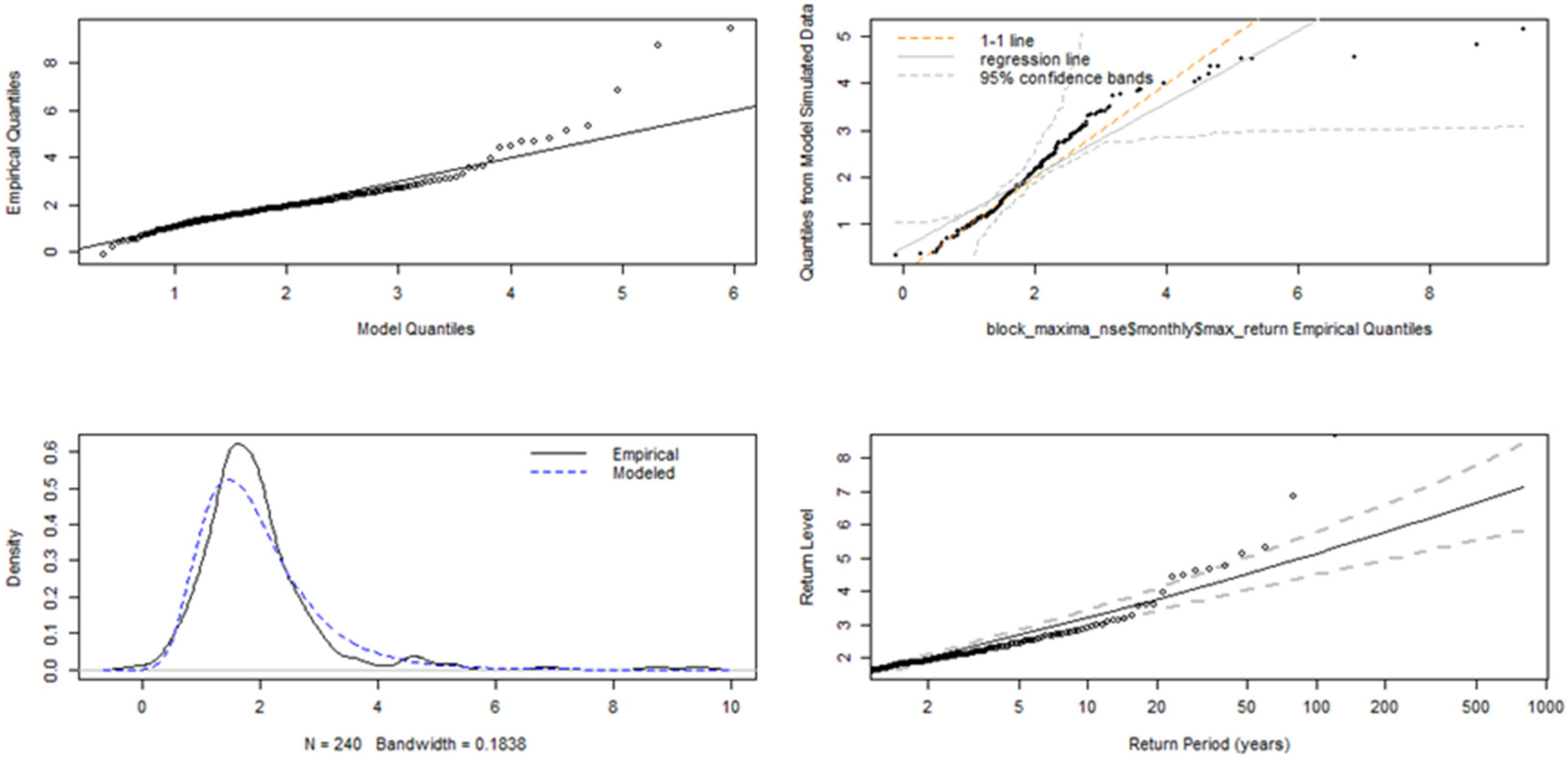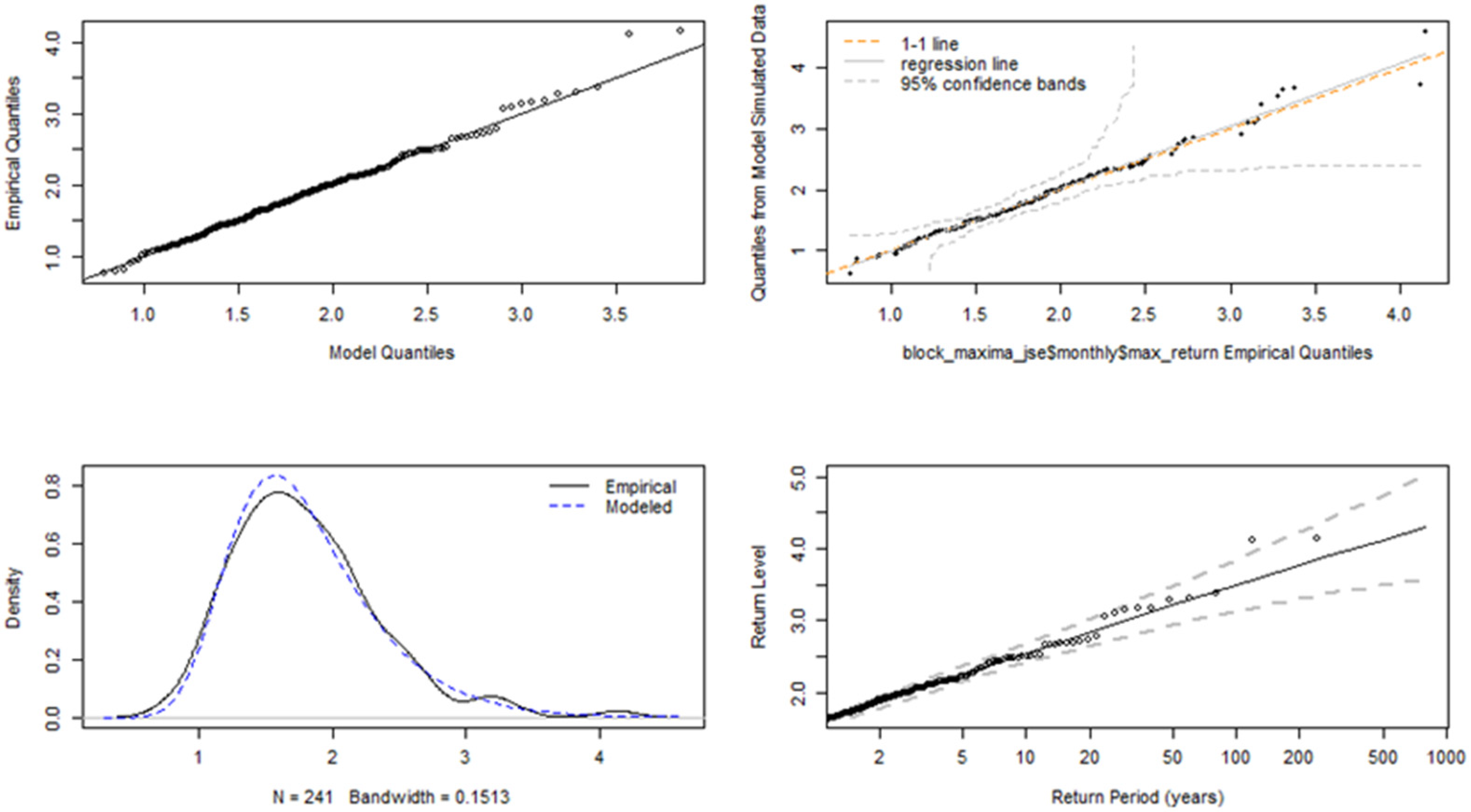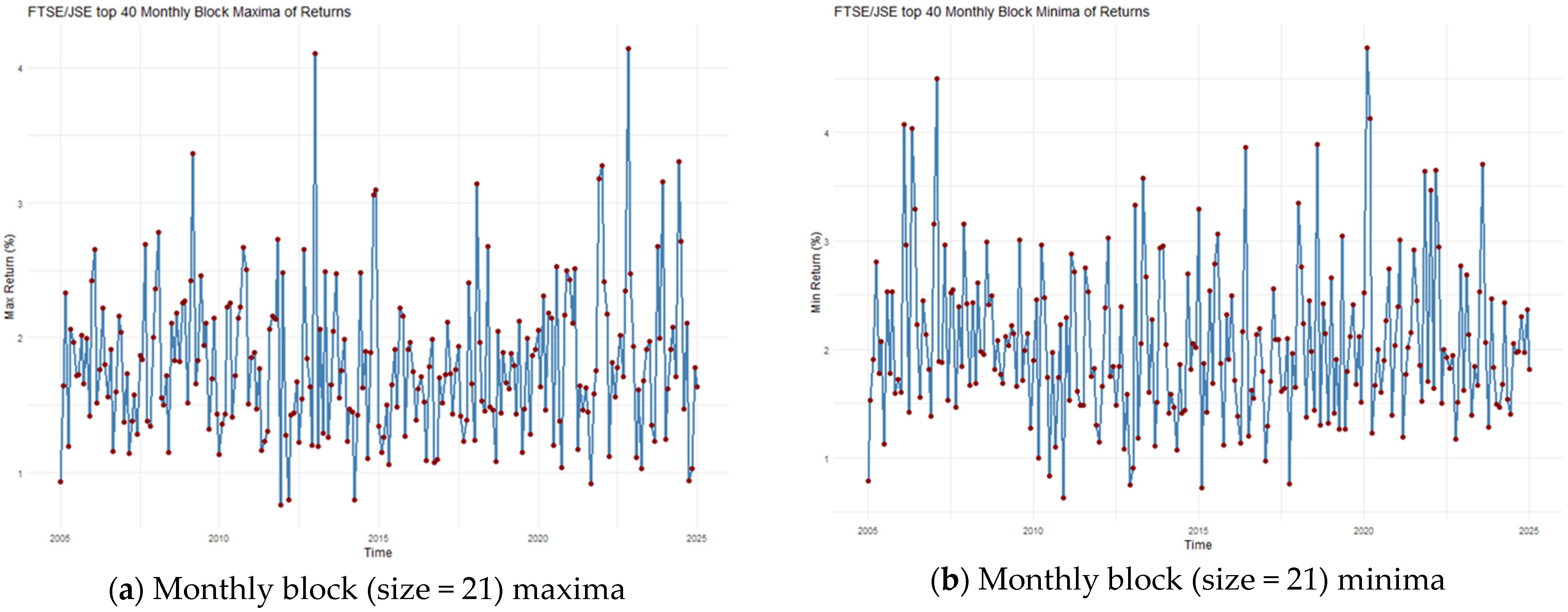 In financial time series, volatility refers to the change in the conditional variance of the returns overtime, and volatility clustering is the idea that large market movements tend to be followed by other large movements; similarly, small market changes also tend to cluster together. Ait-Sahalia et al. (2013) describes the “leverage effect” as the observed tendency of an asset’s volatility to be negatively correlated with the asset’s returns; that is, negative shocks often increase volatility more than positive shocks of the same magnitude. Many different models have been proposed to describe these features in various risk modelling frameworks; this includes models from the Generalised Autoregressive Conditionally Heteroskedastic (GARCH) family which attempts to describe the volatility dynamics of financial data. The intersection between GARCH models and extreme value theory is a very important area in financial risk assessment and management, because it gives a more nuanced understanding of how volatility and extreme events interact. The studies by Echaust and Just (2020) and Makatjane (2019) investigate the effectiveness of these hybrid EVT-GARCH models, focussing primarily on European equities and South African banking stocks, respectively. More specifically, Makatjane (2019) explores these nuances by using a combination of regime-switching GARCH models and EVT models to analyse the risk and volatility of the South African stock market, particularly the FTSE/JSE banking indices. Using ten years of daily data (2008 to 2018) across five major banks (ABSA, Capitec, FNB, Nedbank, and Standard Bank), the study combined volatility modelling with EVT to better capture the clustering of extreme events. The research utilised both the GEVD and GPD models under the BM and PoT approaches, respectively, using maximum likelihood for parameter estimation. Using the Shapiro–Wilk and Anderson Darling tests, the model goodness-of-fit (GoF) was assessed and the results indicated that both models adequately explained the tail risks, although the GPD demonstrated slightly better accuracy due to reduced bias in tail estimation. To quantify the tail-risk associated with these indices, the VaR, expected shortfall (ES), and Glue-VaR risk metrics were computed. Moreover, the results showed that while GEVD and GPD produced comparable results for estimating extreme quantiles, Glue-VaR under EVT provided a more comprehensive and risk-averse assessment, aligning well with Basel II regulatory requirements.