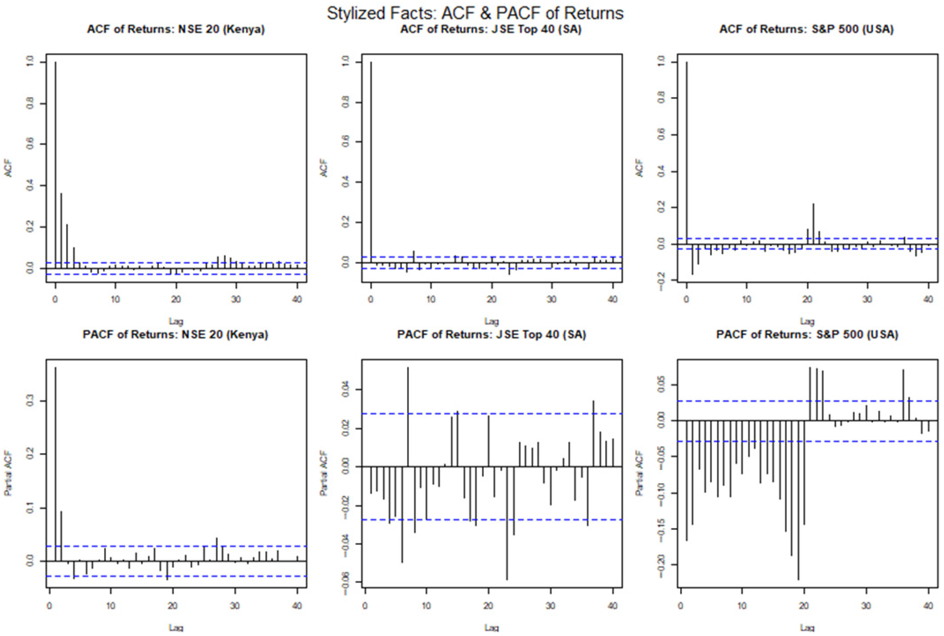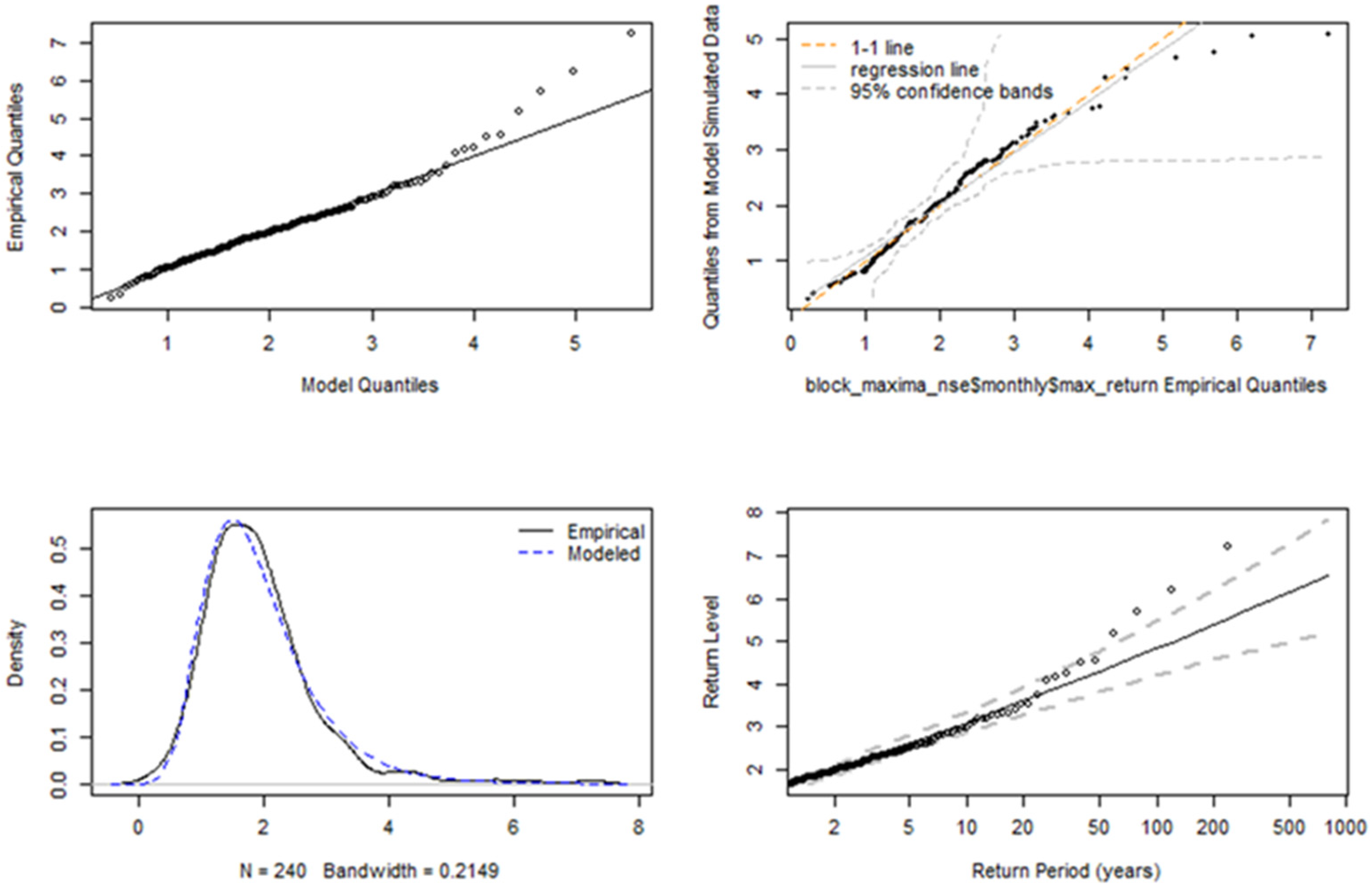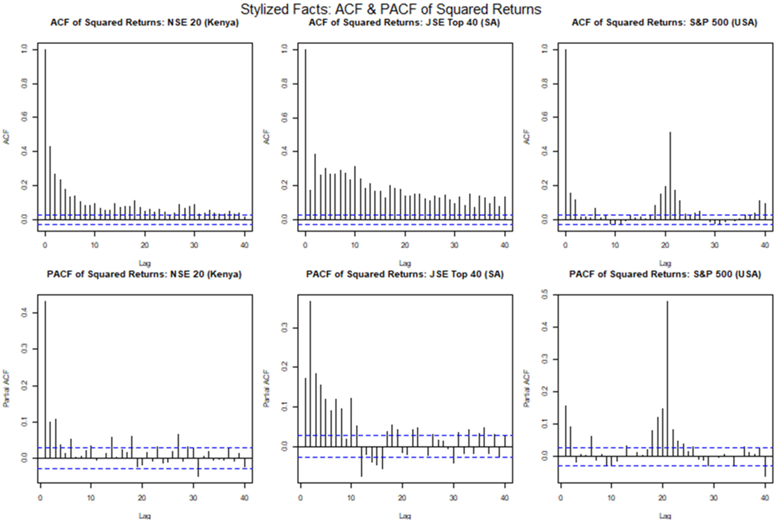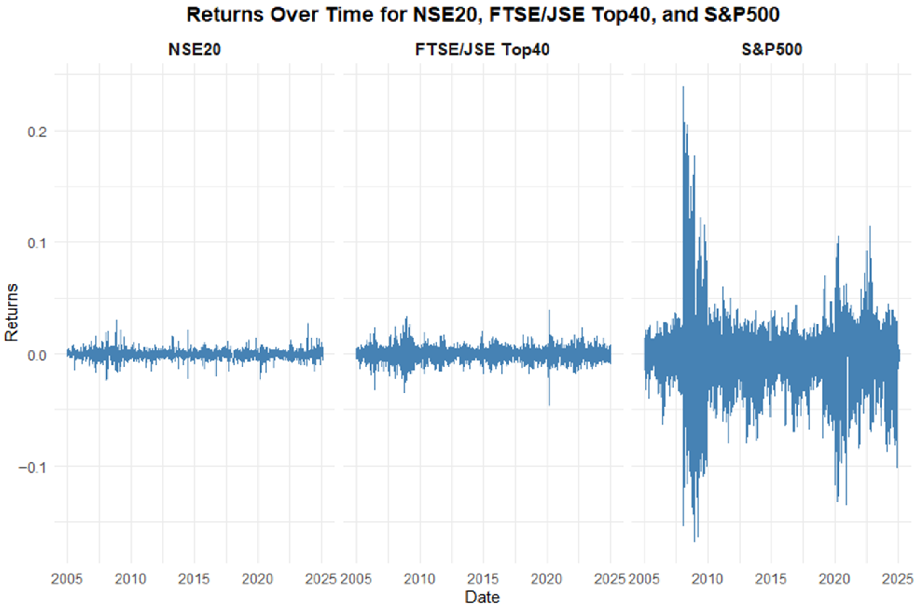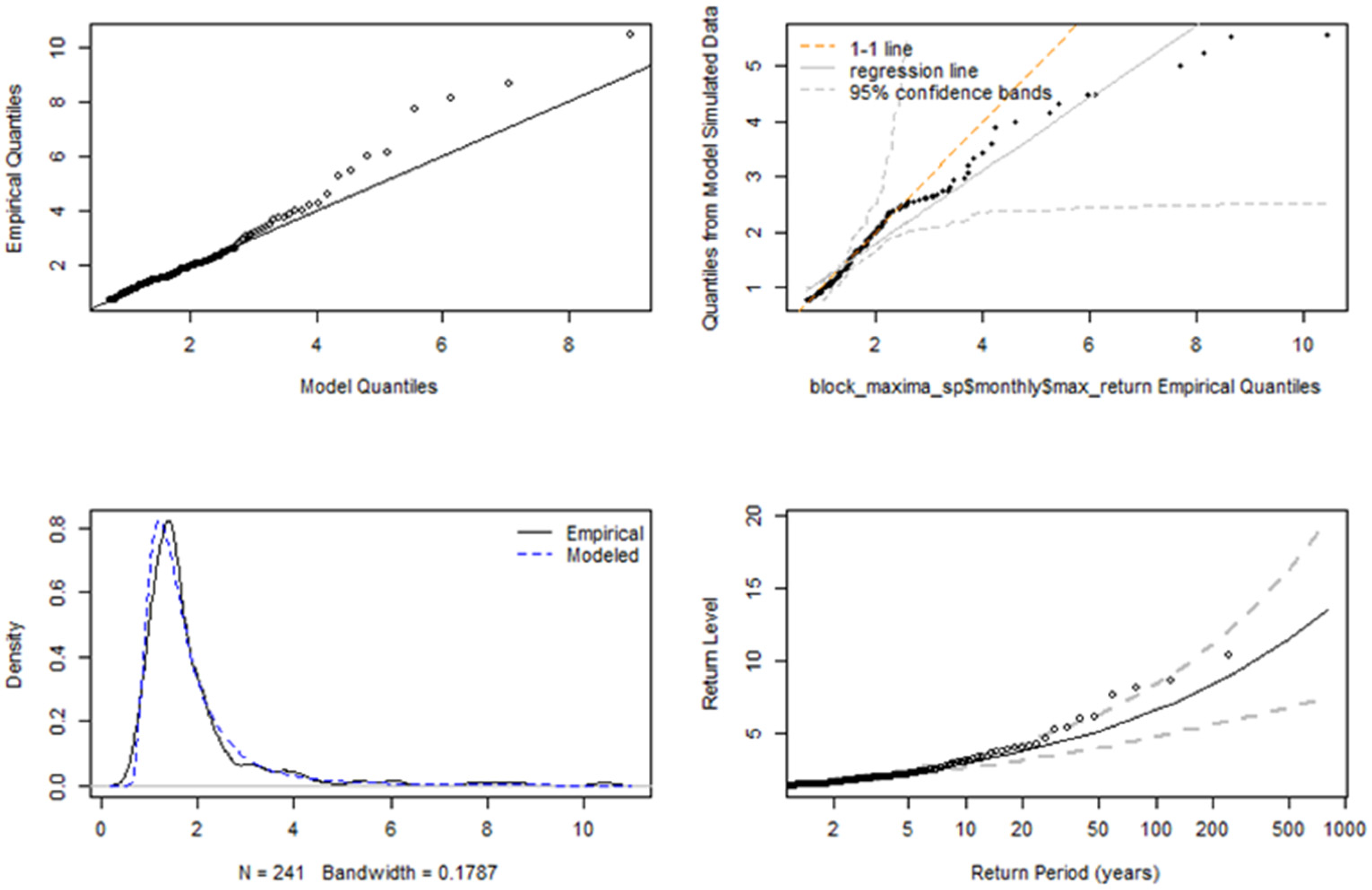In financial time series, volatility refers to the change in the conditional variance of the returns overtime, and volatility clustering is the idea that large market movements tend to be followed by other large movements; similarly, small market changes also tend to cluster together. Ait-Sahalia et al. (2013) describes the “leverage effect” as the observed tendency of an asset’s volatility to be negatively correlated with the asset’s returns; that is, negative shocks often increase volatility more than positive shocks of the same magnitude. Many different models have been proposed to describe these features in various risk modelling frameworks; this includes models from the Generalised Autoregressive Conditionally Heteroskedastic (GARCH) family which attempts to describe the volatility dynamics of financial data. The intersection between GARCH models and extreme value theory is a very important area in financial risk assessment and management, because it gives a more nuanced understanding of how volatility and extreme events interact. The studies by Echaust and Just (2020) and Makatjane (2019) investigate the effectiveness of these hybrid EVT-GARCH models, focussing primarily on European equities and South African banking stocks, respectively. More specifically, Makatjane (2019) explores these nuances by using a combination of regime-switching GARCH models and EVT models to analyse the risk and volatility of the South African stock market, particularly the FTSE/JSE banking indices. Using ten years of daily data (2008 to 2018) across five major banks (ABSA, Capitec, FNB, Nedbank, and Standard Bank), the study combined volatility modelling with EVT to better capture the clustering of extreme events. The research utilised both the GEVD and GPD models under the BM and PoT approaches, respectively, using maximum likelihood for parameter estimation. Using the Shapiro–Wilk and Anderson Darling tests, the model goodness-of-fit (GoF) was assessed and the results indicated that both models adequately explained the tail risks, although the GPD demonstrated slightly better accuracy due to reduced bias in tail estimation. To quantify the tail-risk associated with these indices, the VaR, expected shortfall (ES), and Glue-VaR risk metrics were computed. Moreover, the results showed that while GEVD and GPD produced comparable results for estimating extreme quantiles, Glue-VaR under EVT provided a more comprehensive and risk-averse assessment, aligning well with Basel II regulatory requirements.