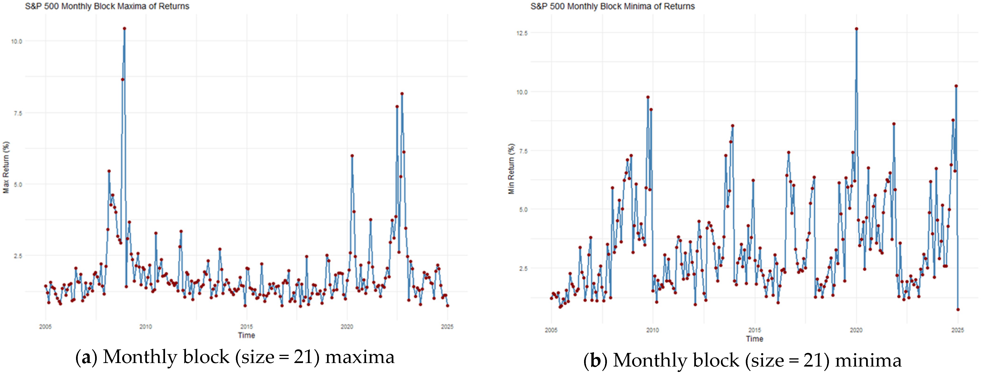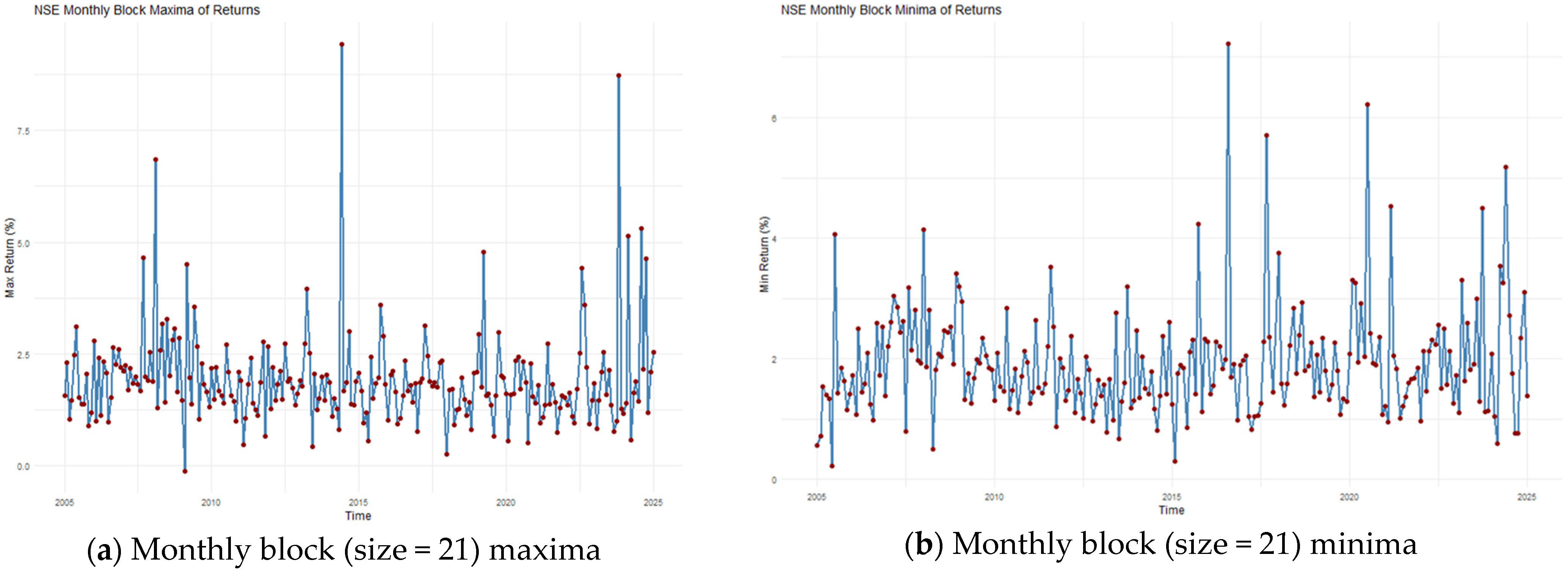 Often times when performing data analysis, we normally use distributions that consider the whole range of data available; see, for example, Marambakuyana and Shongwe (2024a, 2024b), where the full dataset is used to fit standard single, composite, and mixture distributions. However, another approach is to look at distributions that consider maximum values for each block of data. This kind of approach is in the area of generalised EVT (Sweeting, 2011). The main idea with this approach is to use the BM method, i.e., the data is decomposed into similar period intervals, and then the maximum values for each period are considered (Bakali et al., 2021).