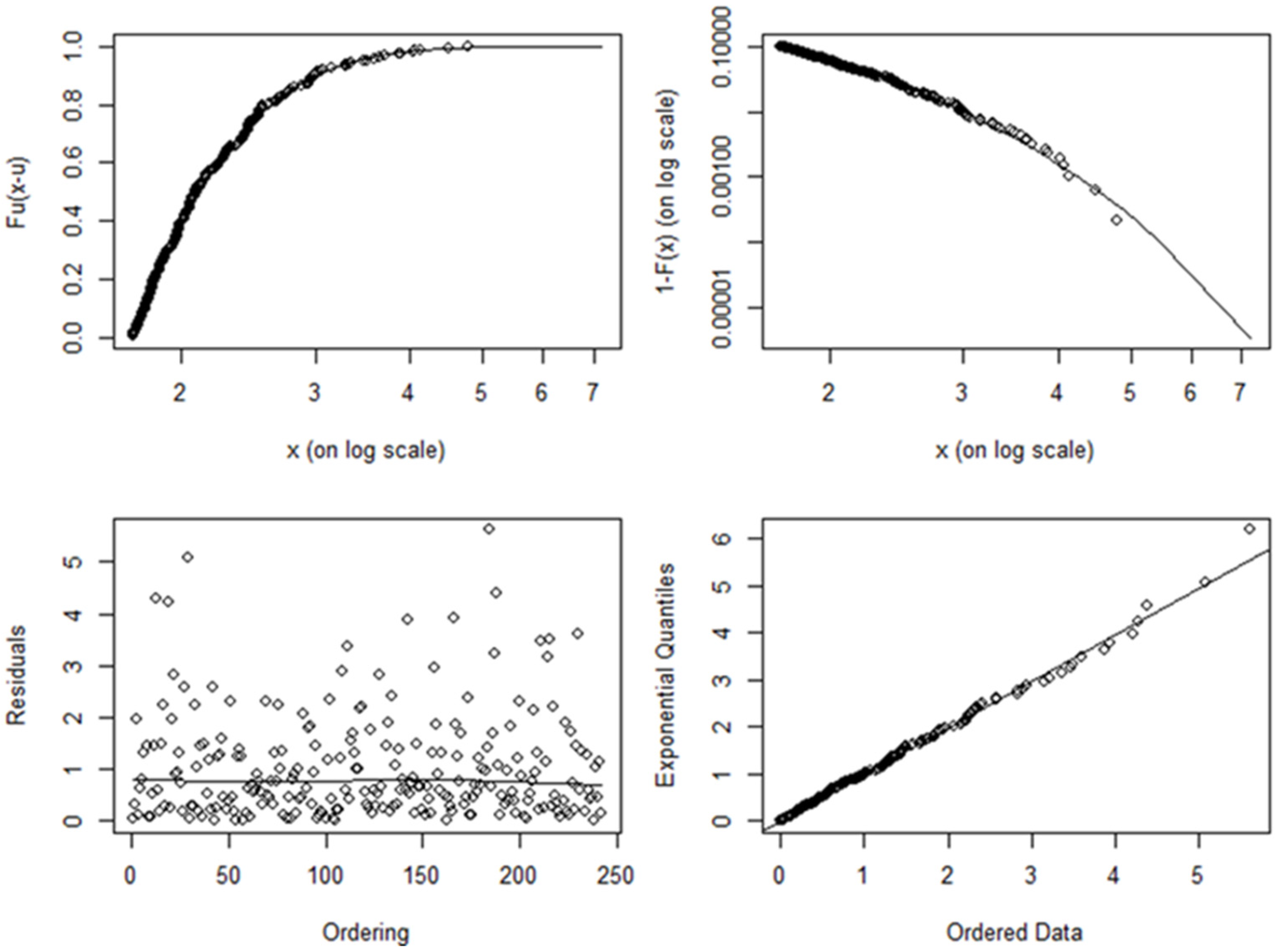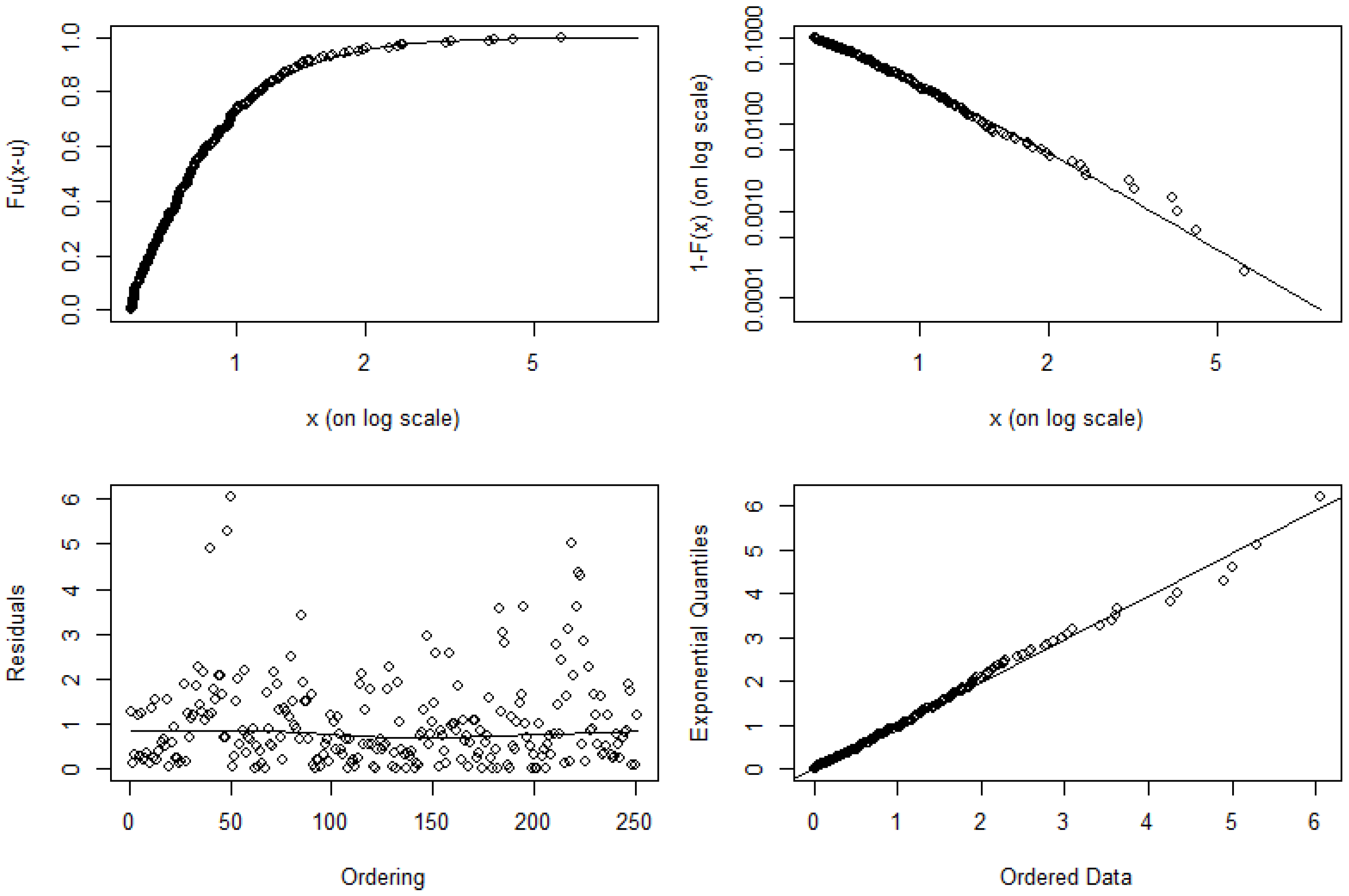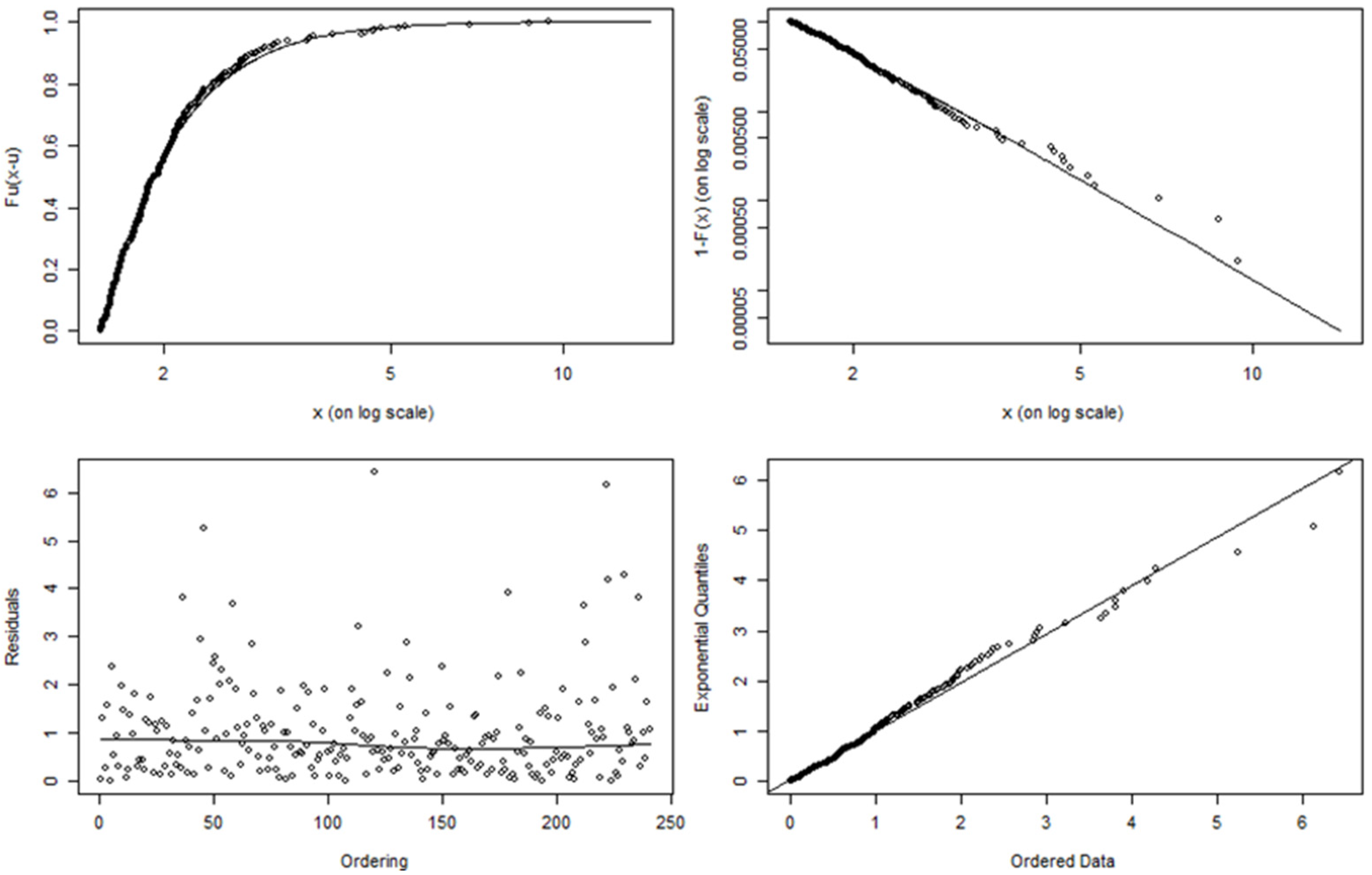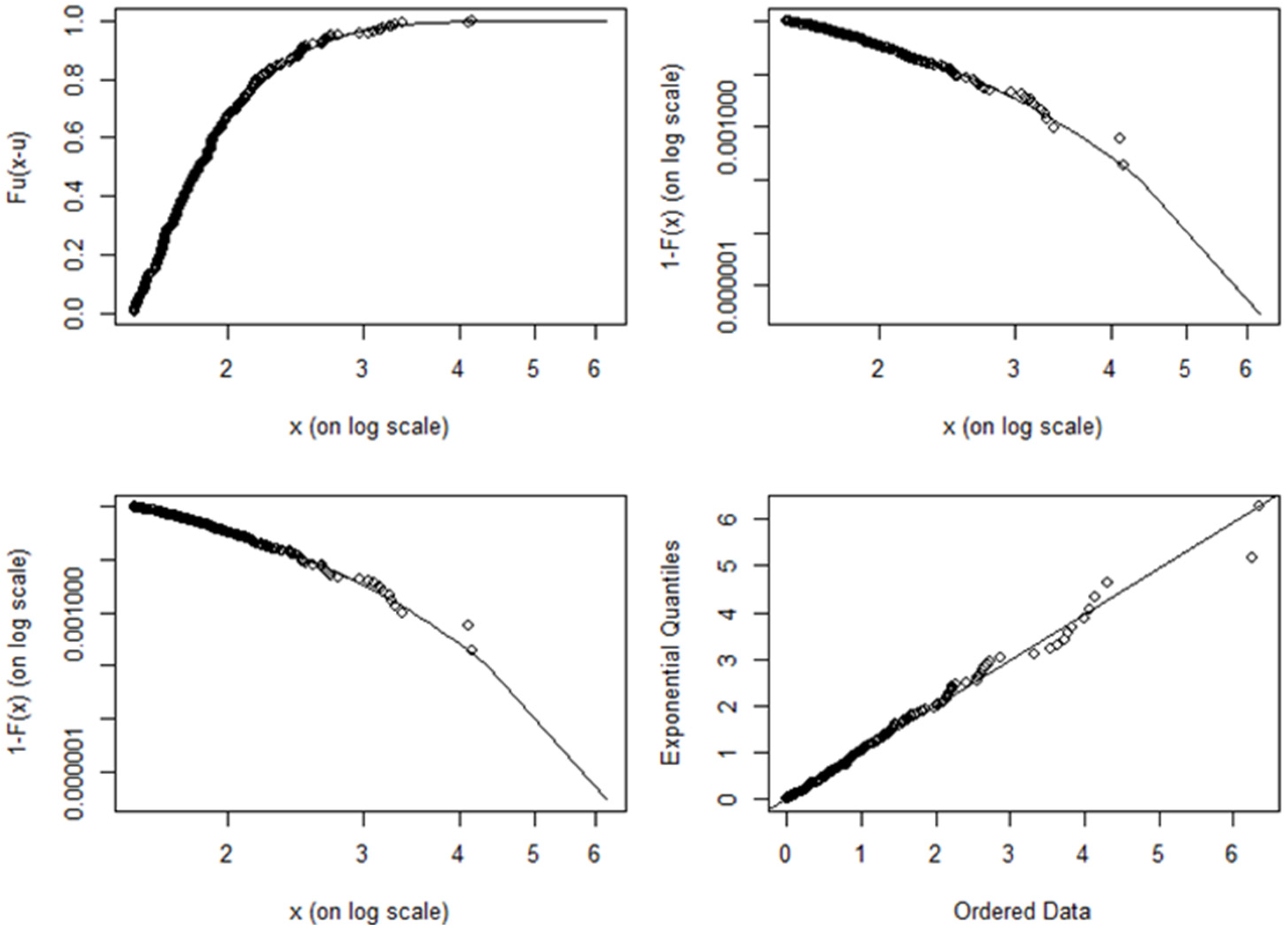 where x refers to the extreme observations above the threshold and < μ < ,   β > 0. Note that μ ,   β , and ξ are location, scale, and shape parameters, respectively. Note that in Sweeting (2011), Equation (18) is only defined for a special case where μ = 0 and β = 1 . The key practice to consider here is the method for selecting the threshold. If the threshold is too high, there will be insufficient data to use, and the parameters estimated from the data sample will be inaccurate. However, a threshold being too low is likely to violate the asymptotic basis of the model which leads to bias (Benito et al., 2023).