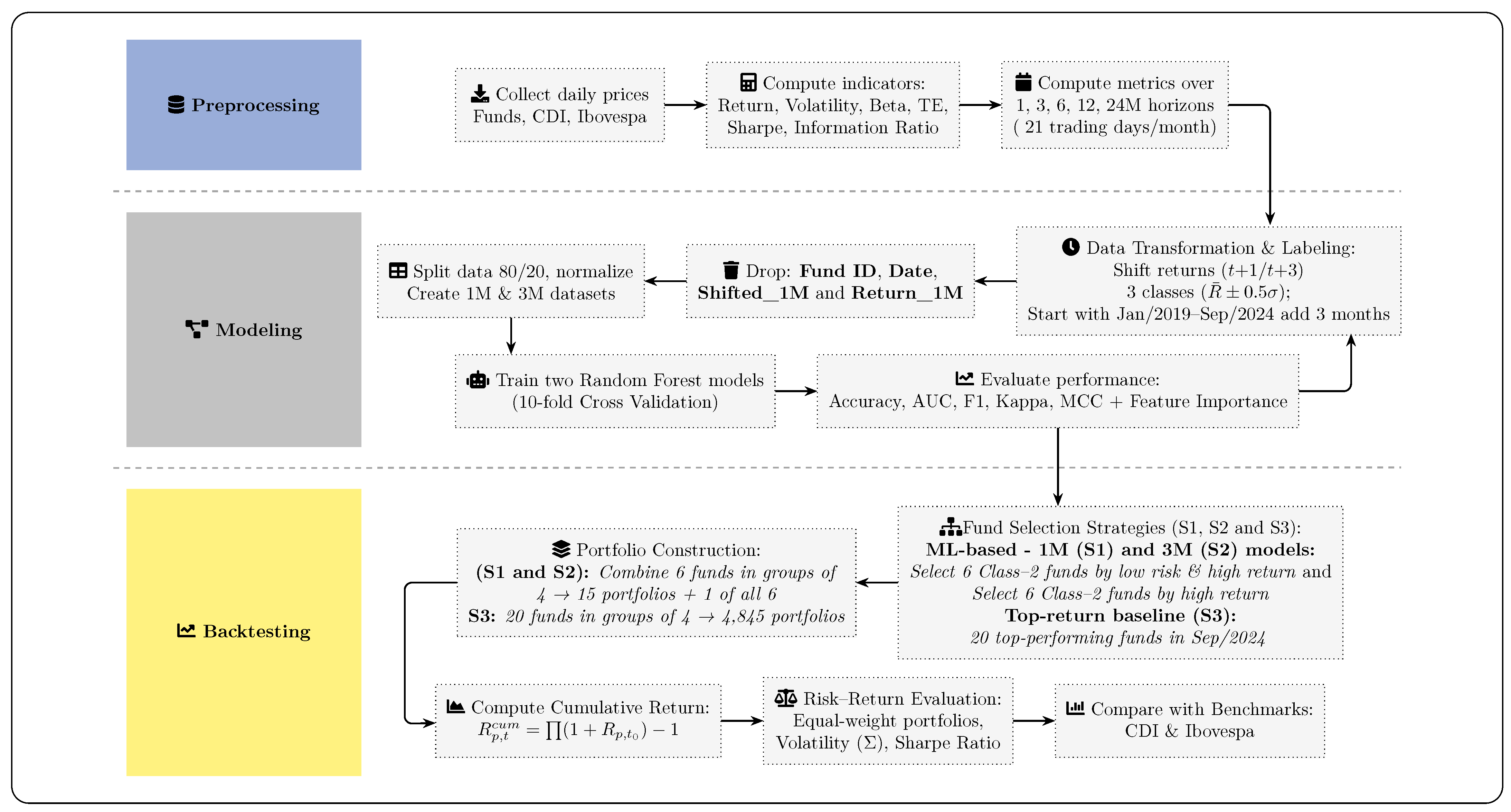 Figure 1. Data collection and computation of performance indicators were performed during preprocessing. In the modeling stage, the Random Forest (RF) algorithm was applied due to its efficiency, robustness, and interpretability. Finally, backtesting evaluated the models through projections and risk–return analysis. All analyses were implemented in Python 3.11.13 using the PyCaret 3.2.0 library.