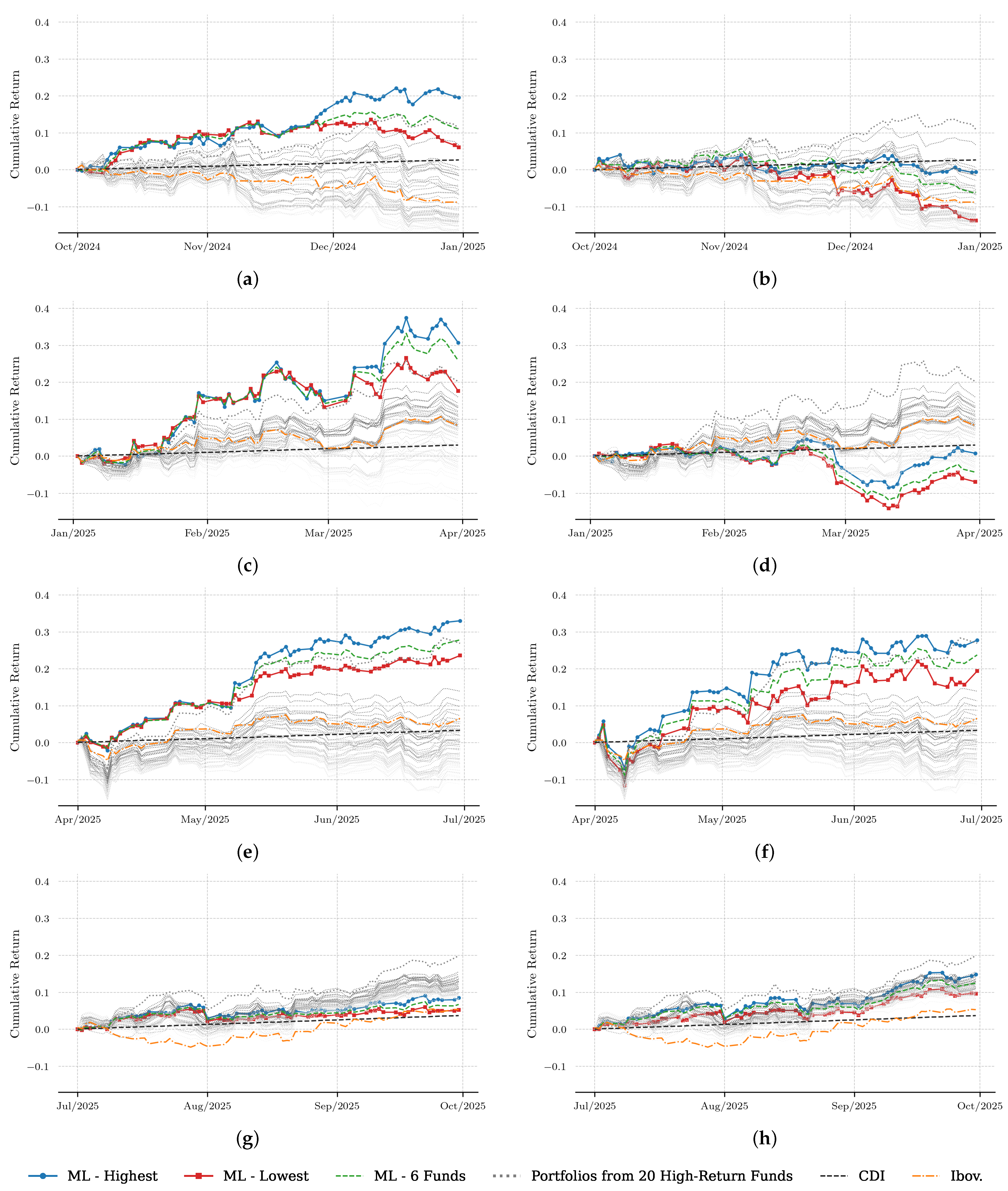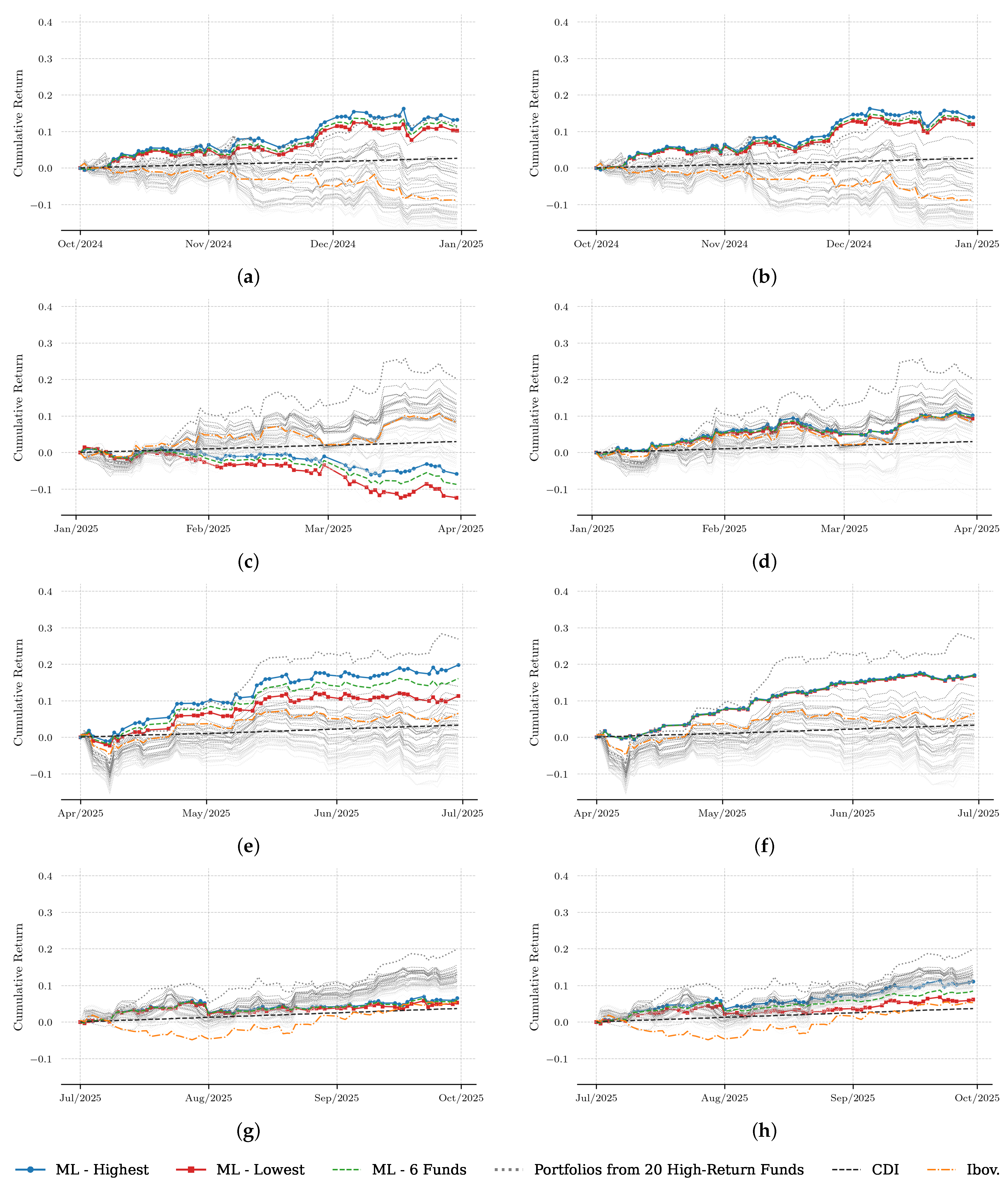 Jiang et al., 2020), nor to benchmark predictive models against alternative forecasting algorithms, but to evaluate the economic effectiveness of ML-guided fund selection under realistic investment conditions. Accordingly, the performance of ML-based portfolios is assessed relative to the CDI (risk-free rate) and the Ibovespa (broad equity market), which constitute the natural investment benchmarks faced by Brazilian investors. The results indicate that RF-based selection provides meaningful guidance in identifying attractive funds and can outperform these benchmarks over the evaluation period.