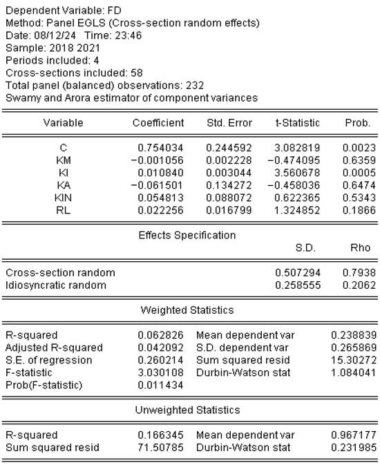 In the subsequent phase, following the completion of the classical assumption tests and model selection procedures, regression estimation is carried out to evaluate the impact of the independent variables on the level of financial distress. The Hausman test suggests that the random effects model is the most appropriate specification; therefore, this study employs the Panel EGLS (Cross-Section Random Effects) approach. Figure 2 presents the outcome of the panel data regression analysis for the financial distress model.