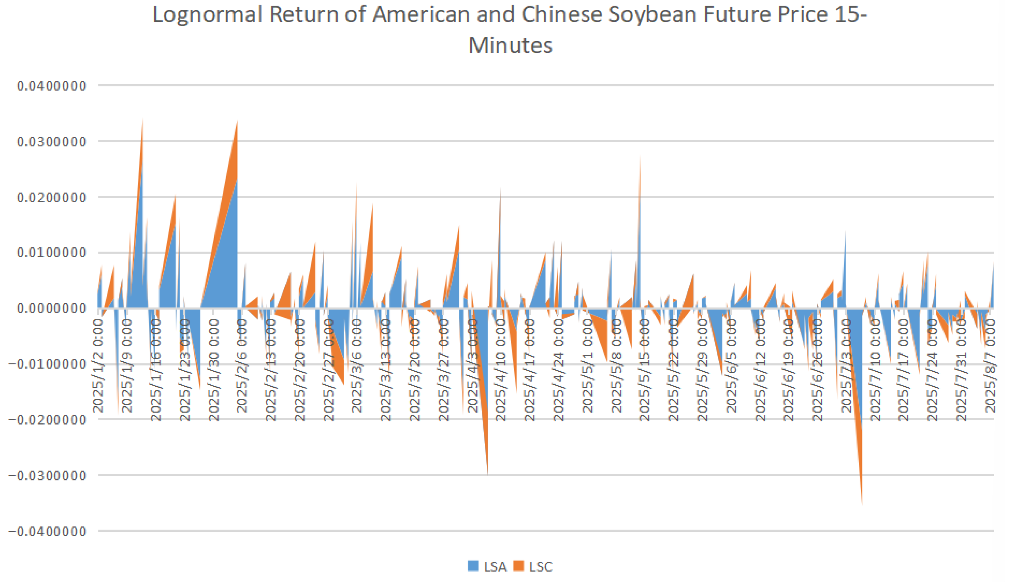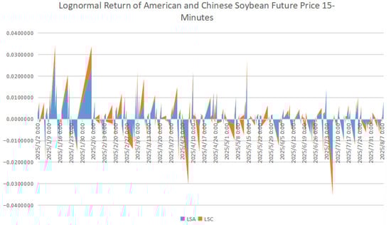 We find significant differences in the trading strategies between CBOT and DCE markets in Figure 1, “U.S. and China Soybean Futures Price”. The Chicago Board operates trading sessions throughout the day at 08:30–13:20 and 19:00–07:45 (local time), while the Chinese market is divided into three trading sessions at 09:00–10:15, 10:30–11:30, and 13:30–15:00 (Beijing time). In the following analysis, according to Figure 2, we first remove all non-synchronized times to make the corresponding 15 min prices available for comparison. The dataset provides synchronized price pairs between the soybean futures of two countries with a time observation range from 1 January 2025 to 31 July 2025.