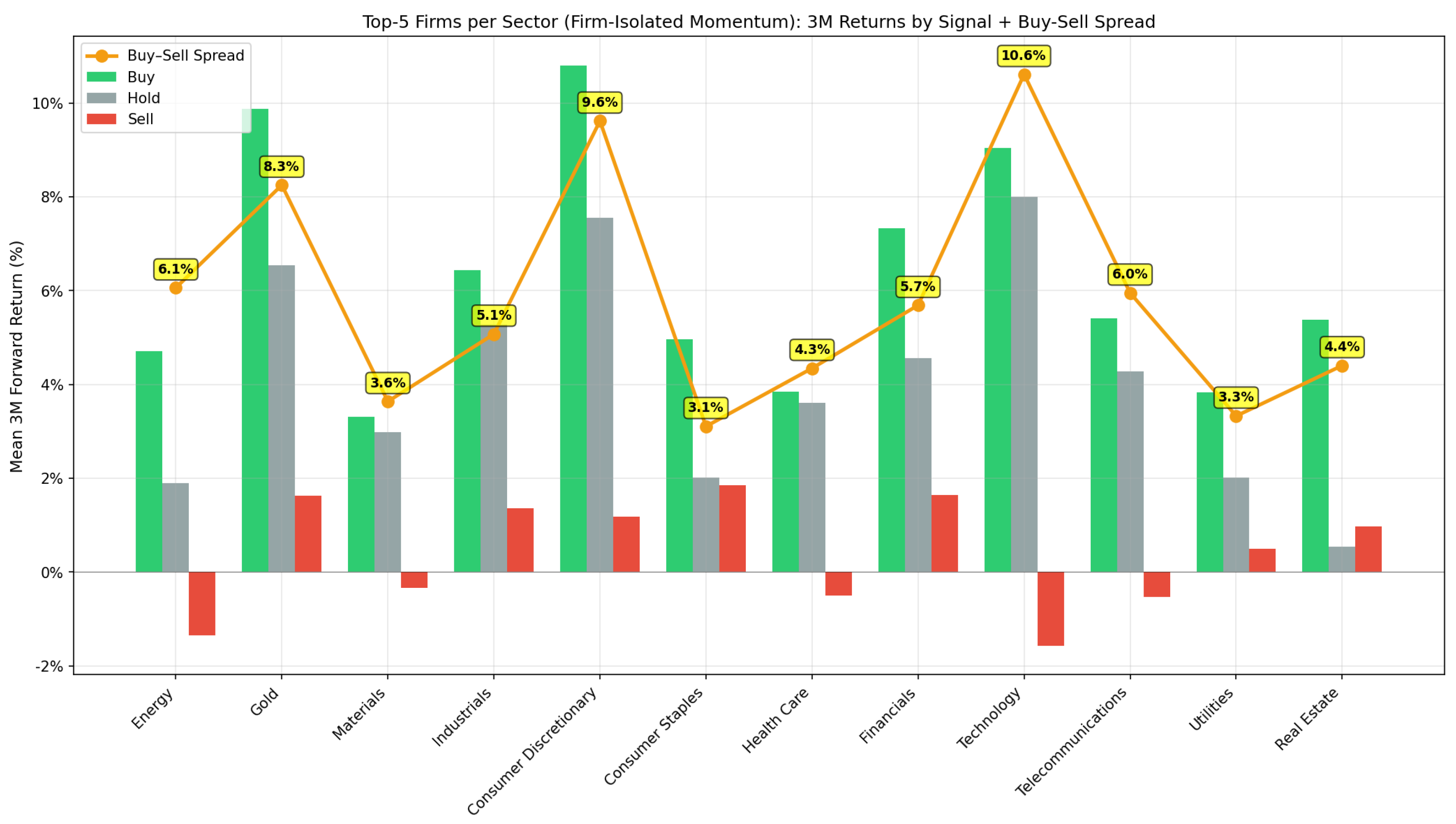 Notes: Best Spread = the highest individual firm spread within each sector (from the #1 ranked firm); Agg. Spread = the combined Buy–Sell spread when pooling all signals from the sector’s top-5 firms (matches Figure 2); Coverage = the percentage of the top 10 stocks (by market capitalization) in each sector covered by the aggregated top-5 firms. Spread values represent 3-month forward returns (Buy signals minus Sell signals). Rankings are determined using firm-isolated momentum methodology with a minimum of 5 observations per signal category for most sectors (3 observations for the Gold sector due to lower coverage).