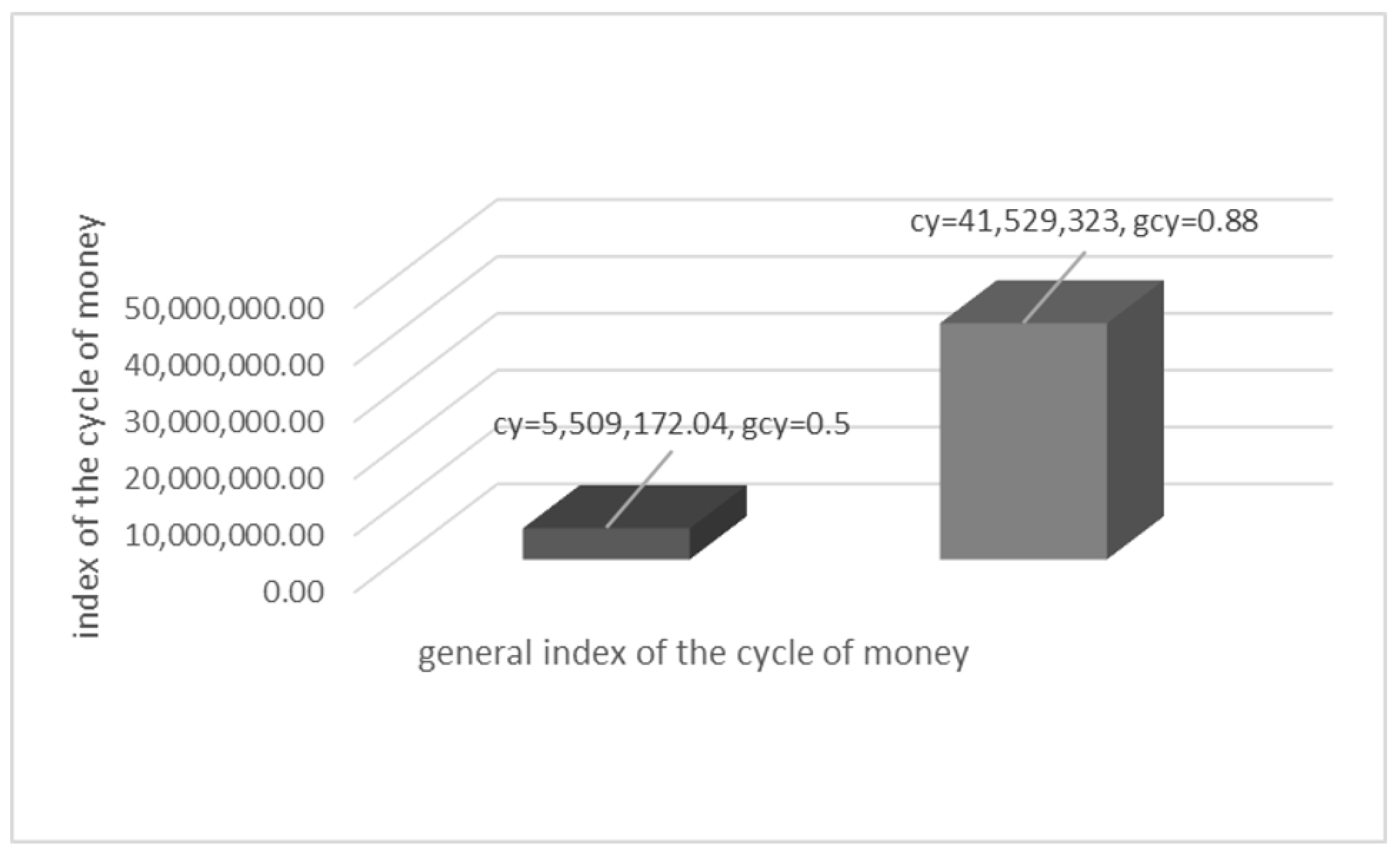 Figure 4 illustrates the comparison between the general index of the cycle of money for Cyprus and the global average. The global benchmark stands at approximately 5.5 million, corresponding to a global cycle-of-money index of 0.5, which represents the threshold of a well-structured economy capable of withstanding economic shocks. In contrast, Cyprus displays a substantially higher value of 41.5 million, corresponding to a cycle-of-money index of 0.88, indicating a significantly stronger distribution and reuse of money within its economic system. The visual contrast between the two bars highlights the extent to which Cyprus exceeds the global norm, reinforcing the study’s conclusion that the Cypriot economy maintains a highly efficient internal monetary circulation and possesses enhanced resilience against financial crises.
