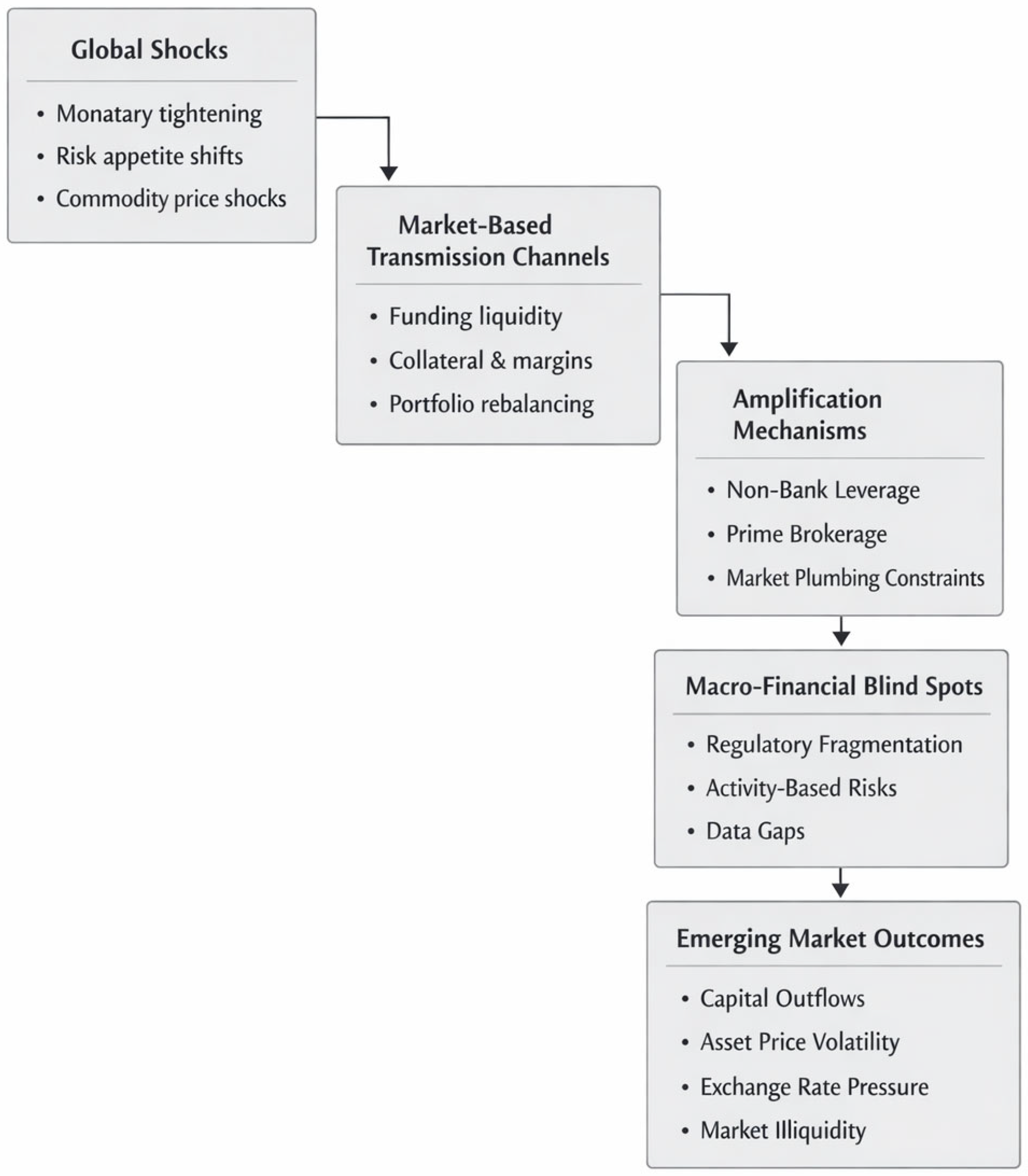 This paper has argued that the persistent vulnerability of emerging market economies to global financial shocks cannot be adequately explained by weaknesses in bank balance sheets, domestic macroeconomic fundamentals, or insufficient regulatory effort. Instead, it reflects deeper structural features of contemporary financial systems in which market-based intermediation, short-term funding, and fragmented regulatory oversight play a central role in the transmission and amplification of global disturbances.