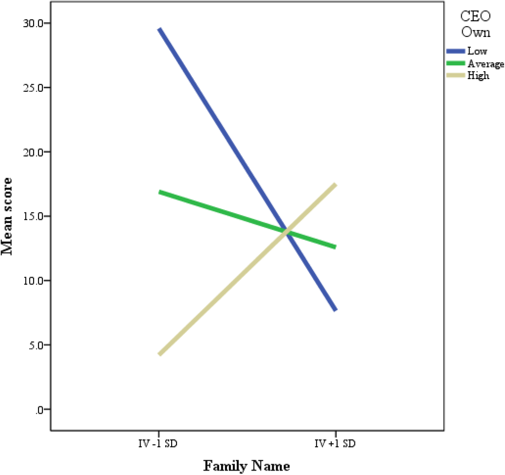 For further explanation of our results, we plotted the three significant moderations effects. We followed the procedure explained by Cohen and Cohen [10] for plotting the interaction effects by setting high and low levels at +/−1 standard deviation. Figure 1 plots the Family Successor as CEO and CEO Chair. It can be noted the negative slope in the high proportion of duality (CEO and Chair). Figure 2 and Figure 3 plot the Family Name and CEO Own and CEO Chair, respectively, where it can be noted the positive slopes in the high proportion of both moderators. Overall, our exploratory analysis provides empirical support for all of the hypotheses except H3a.