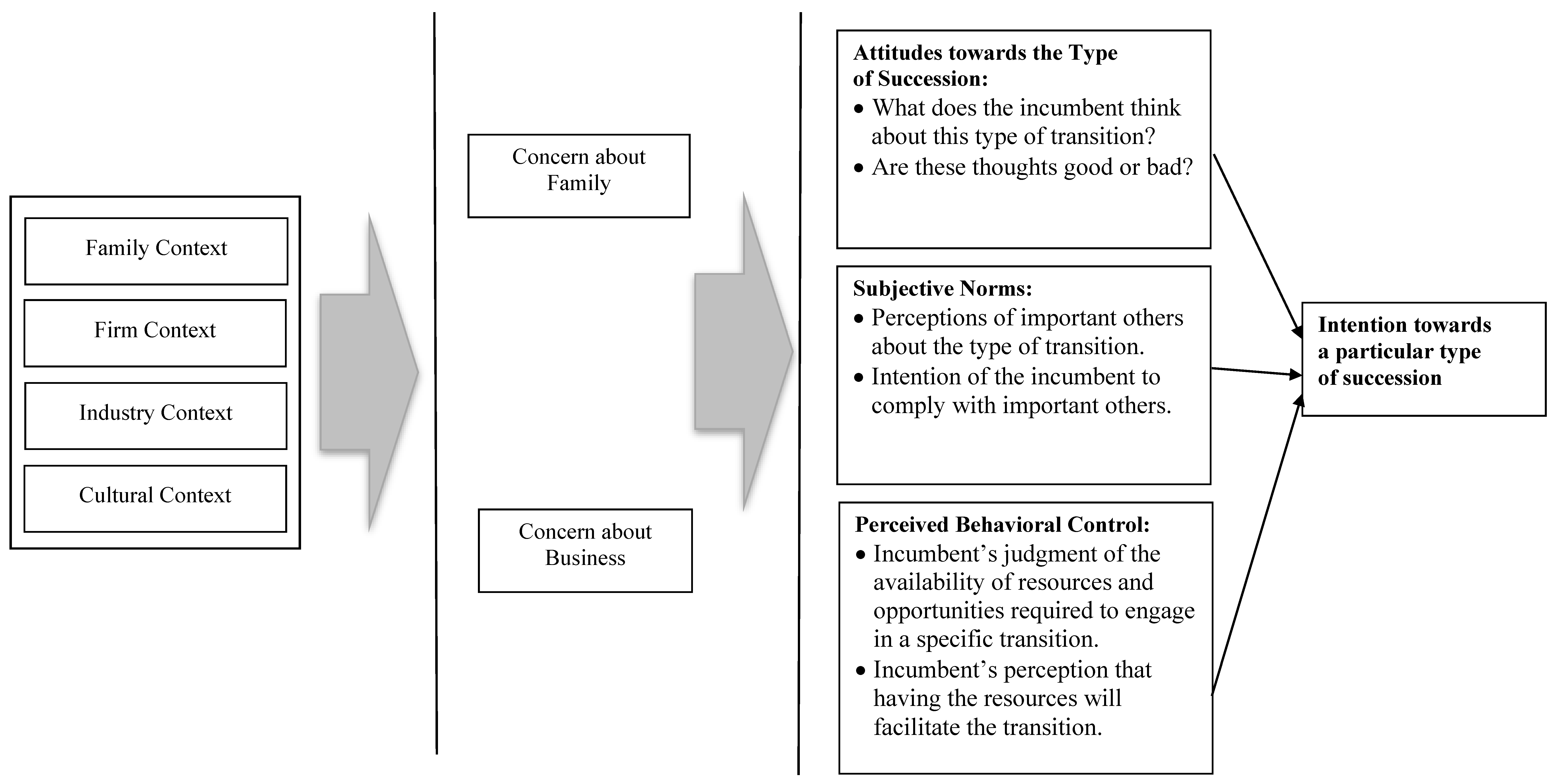 In the family business literature, succession research has focused on the family member as they enter the leadership role or on the different issues that affect the succession process. Although researchers have acknowledged that succession in family businesses is “punctuated” by decision making events, less attention has been given to understanding how incumbents make decisions about ownership and management transitions. In an effort to continue to understand the succession process it is important to understand how incumbents make decisions about the type of transitions they intend to engage in (i.e., intra-family succession, out of family succession, or no succession). Building on the theory of planned behavior and the socioemotional wealth framework (SEW), this manuscript presents a conceptual framework to understand the factors that influence succession transitions and the role that contextual factors can play in this decision-making process. We present theory driven propositions and discuss the implications for understanding and evaluation of the succession process.