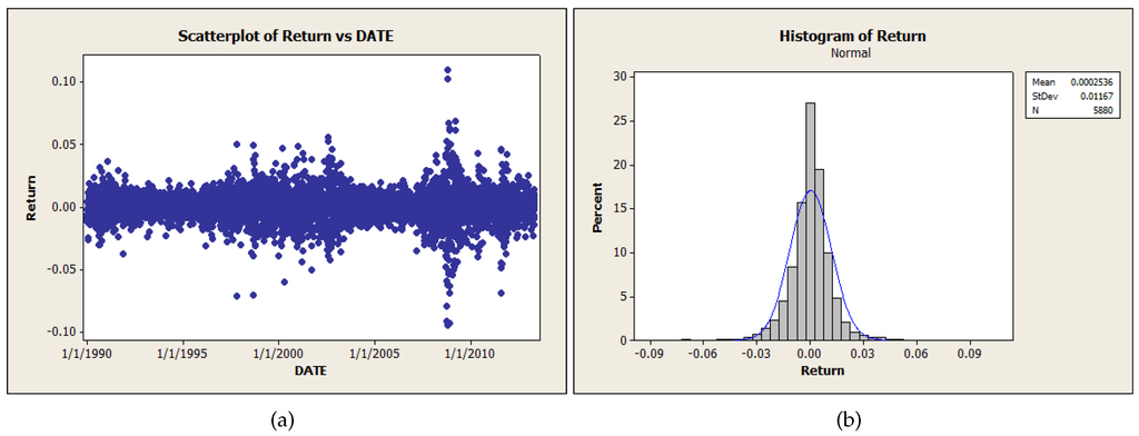 Figure 1 shows the log return of the daily S&P 500 Index and its histogram of the market data from Jan 2, 1990 to May 2, 2013. The normal distribution density curves are provided as well.