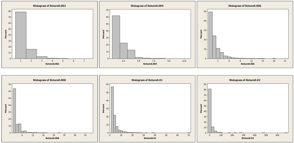 For the same set of data as in Figure 1, we first remove the mean of the return and get the excessive return data. Notice that the all time mean of the original data is 0.000254, which is very close to zero. Table 1 provides some basic statistics on the excessive return with a certain minimum magnitude. For example, the variable “Return0.01” represents the return with absolute magnitude of at least 0.01, which indicates a daily index change being greater than or equal to 1% over the all time average. Thus, the entire observations are grouped into several level sets. The box plots for these groups of variables are shown in Figure 3.