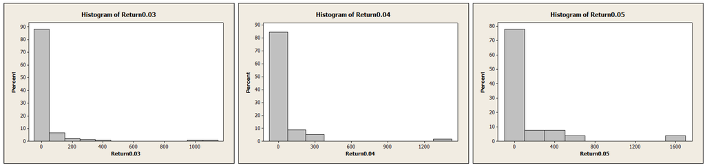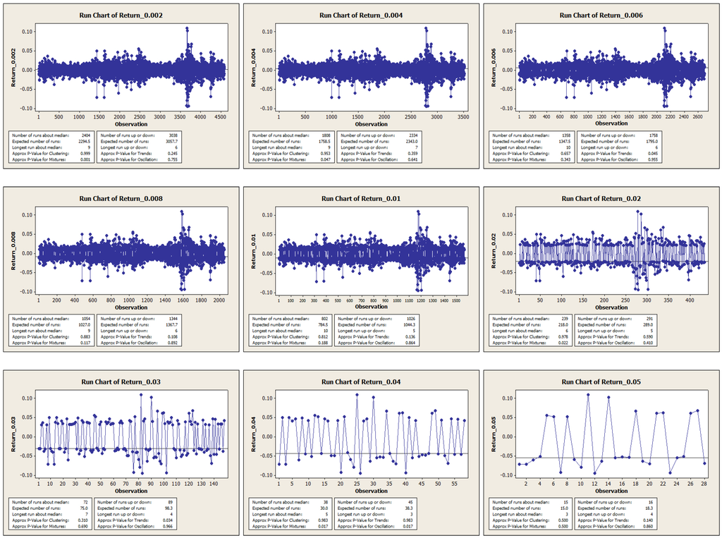 We notice that the oscillation in the group “Return 0.04” is especially significant (p-Value = 0.017). In the meantime, we understand that if we change the cutoff of the magnitude, a few observations are inserted into or discarded from the original set. Recall that the Run Test for randomness is very sensitive to the order of observations, and, as a consequence, the test results for randomness could be very different from group to group.