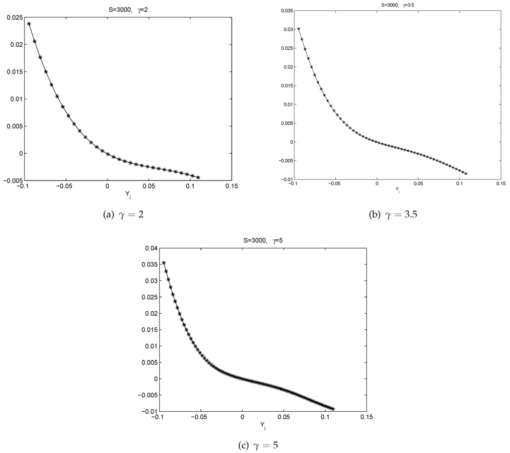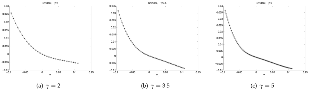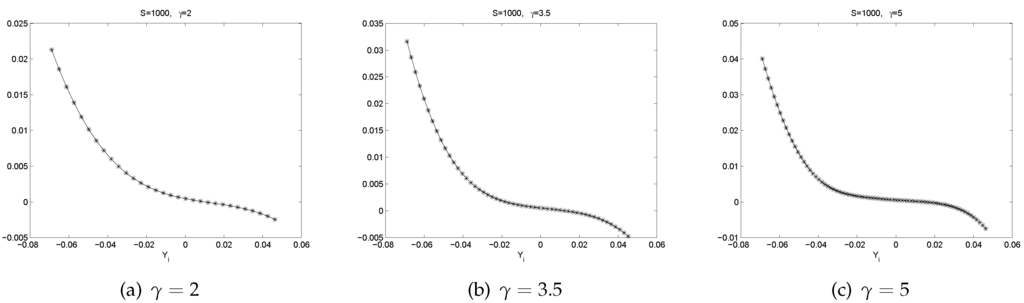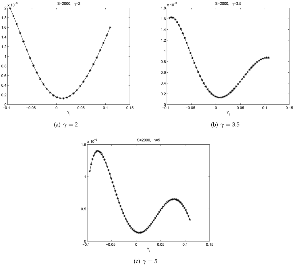 Let be the daily data of S&P500 index where the last date is May 2, 2013, and let be the yield process, i.e., . For each data size S, we choose the bandwidth h to be , where all ’s belong to this set and γ is a chosen positive constant. In what follows, we shall pick different data sizes and different values of γ, and plot the graphs of and .