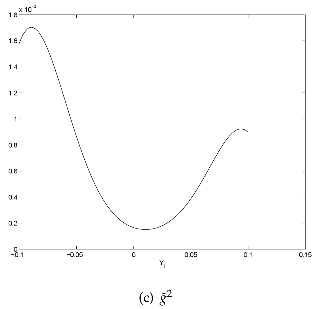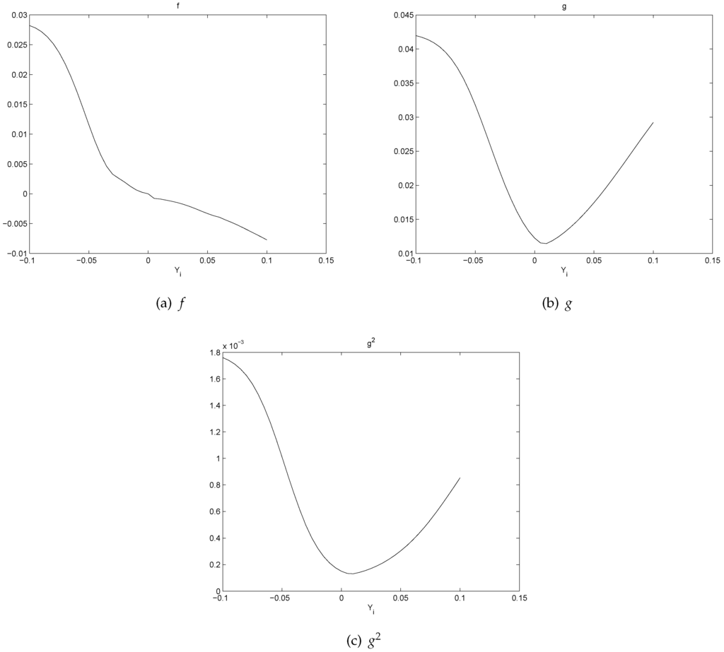 These last types of investors are assumed to behave in the following way. In one aspect, they are trend chasers on the return process (not the price process) since their instant demand of the asset is proportional to . On the other hand, they believe that the return process should be mean reverting, thus their instant demand is assumed to have the form , where achieves the maximum when y is close to zero and decreases whenever y is away from zero. An illustrative graph on is shown in Figure 22.