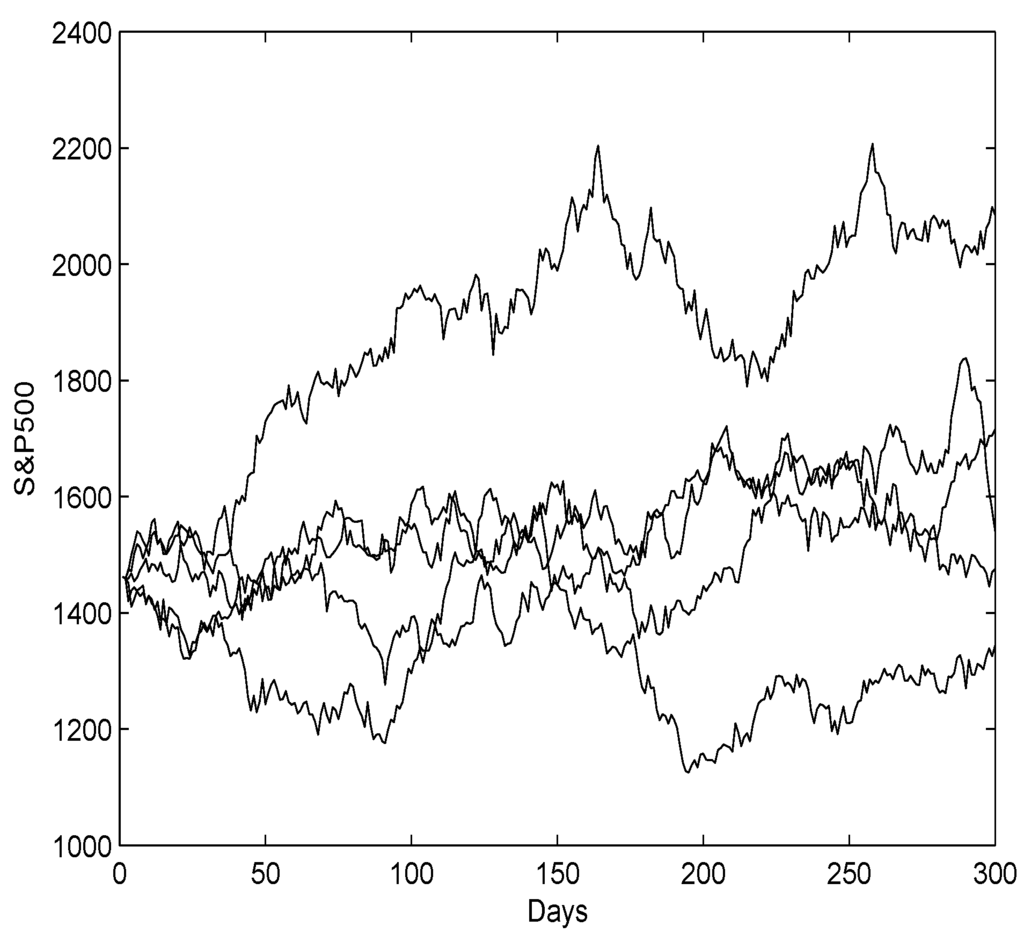 It can be seen that this model is a local volatility model, but, different from most well known local volatility models which aim to replicate the implied volatility surface only, our model replicates both the drift term and volatility term through real data calibration using the technique of local polynomial regression. Our model is also different from most of the SV models, such as [7], in that the volatility term is a special function of the return. We believe that general linear regression is incapable, if not impossible, of achieving such a model. Figure 14 shows some sample paths of this ARCH model.