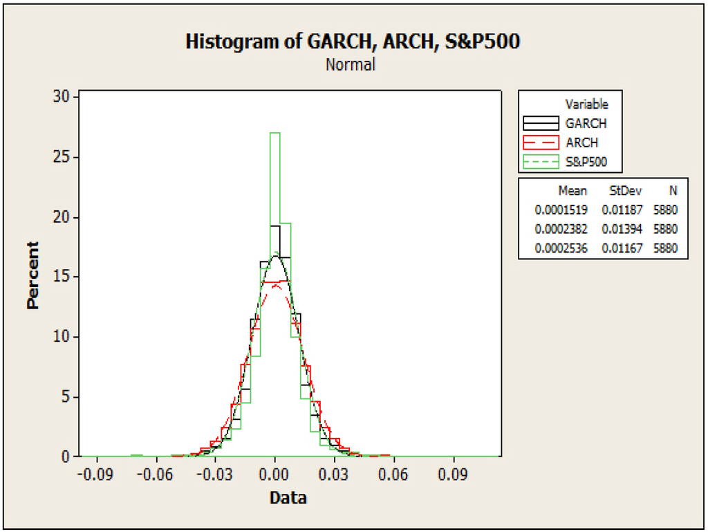 It can be seen from Figure 15 that both the GARCH(1,1) model (6) and (7) and the ARCH model (5) have “fatter” distribution than that of the market data, but the histogram of GARCH(1,1) model fits the histogram of S&P 500 return a little better. We believe that this is due to the natural advantage of GARCH models over ARCH models. A promising future research topic is to incorporate the GARCH model into the nonparametric regression in order to capture more features of the market data.