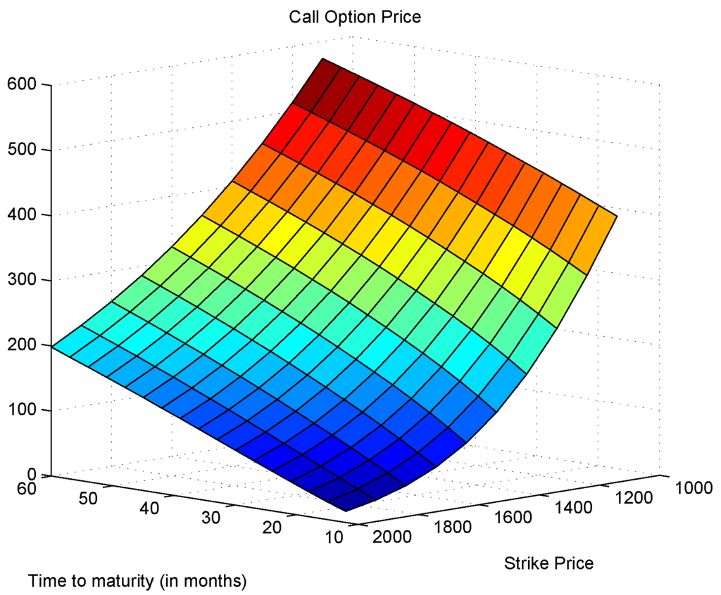 We pick the region and (months) to recover the implied volatility surface from the Black–Scholes formula. The reason is that, on this region the computation is considered to be stable because is not too close to zero. Figure 19 shows the implied volatility surface through the Black–Scholes formula. Thus, the volatility skew can be clearly seen.