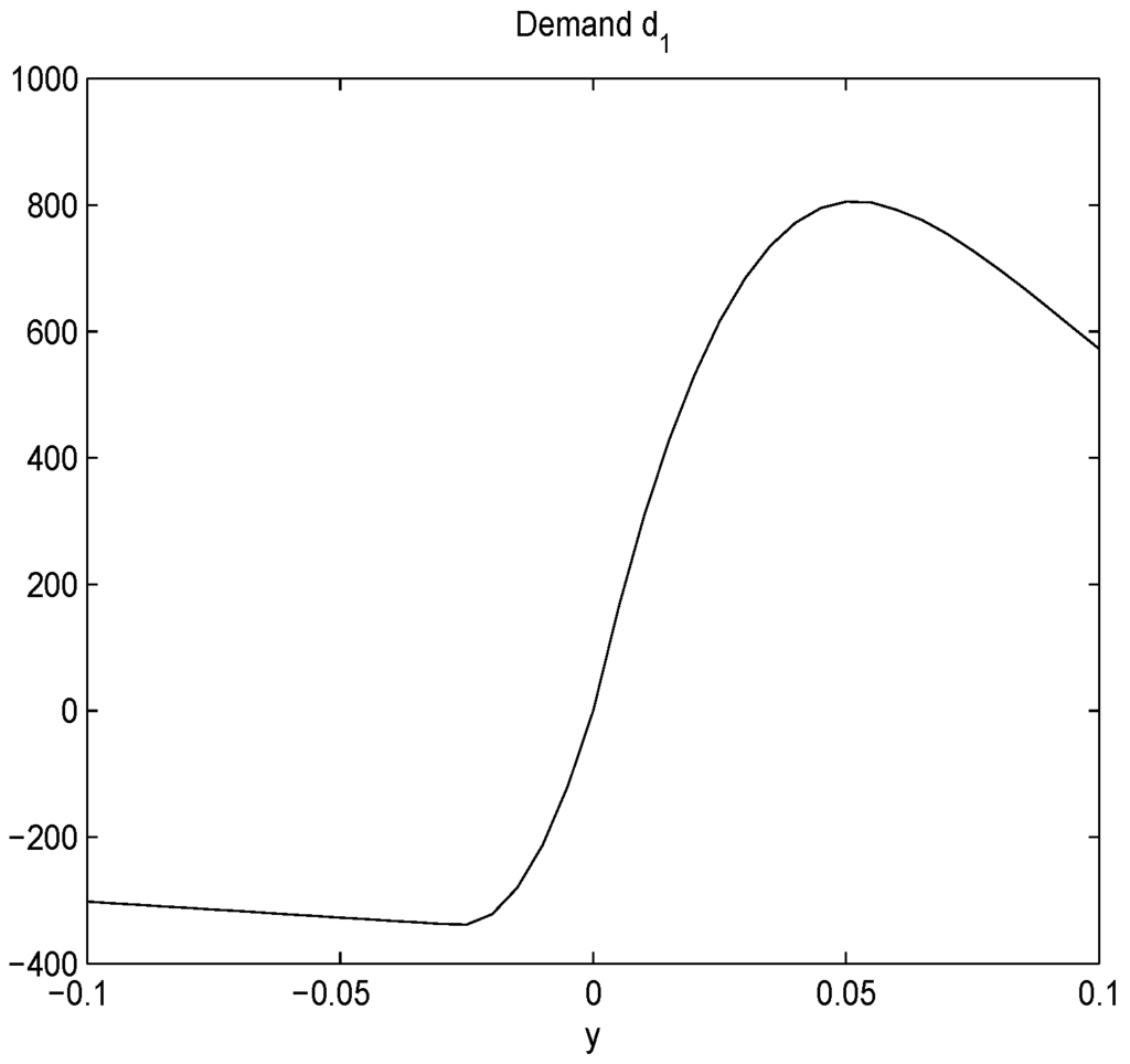 We use to represent this instant demand as a function of the current return y, and the cumulative demand from this type of investors is thus given by . Later, if we need a discrete model, we use index i to denote the sample at time , and then will be the corresponding excessive demand function at time .