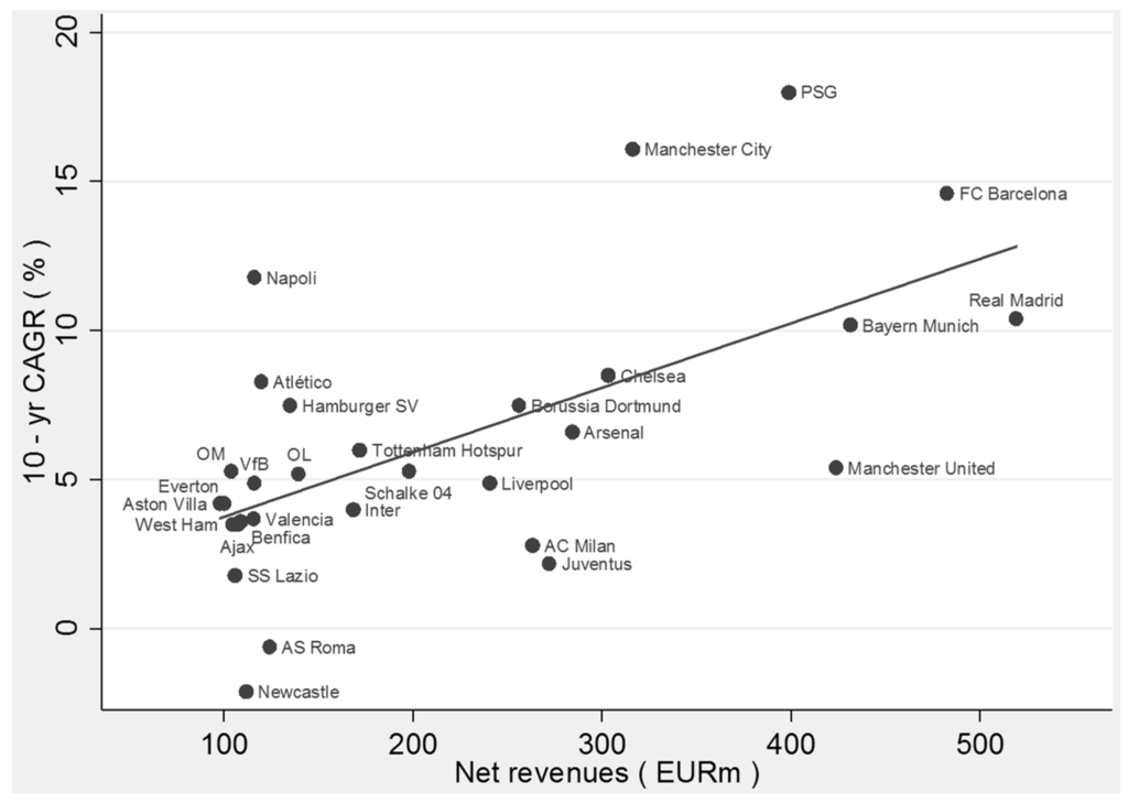 The relationship between revenues and financial growth indicates a growing gap between Europe’s leading football clubs and its followers (Figure 1). Dietl and Franck [18] found growing revenue asymmetries in Europe’s “Big Five” leagues. Our data indicate that this phenomenon has escalated among the top 30 EU football clubs. Revenues in 2012/13 and 10-year growth rates are strongly correlated (r = 0.613). While the top 30 revenue-generating clubs have grown, on average, by 6.0% per year, the top 15 clubs have grown by 7.9% p.a., the top ten clubs have grown by 9.5% p.a., and the top five clubs have grown by 11.7% p.a. This compares to the bottom 15 clubs (4.3% p.a.), the bottom ten clubs (4.0% p.a.), and the bottom five clubs (3.8% p.a.).