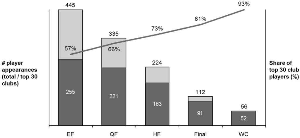 In the 2014 FIFA World Cup, the top 30 clubs have provided the majority of players (Figure 2). They account for over 50% of appearances in the elimination round. The further the cup proceeded, the higher was the share of appearances by players from top 30 clubs. They account for about two thirds (66%) of end round appearances by the quarter finalists, around three quarter (73%) of appearances by the half finalists, and over 80% of appearances by the finalists. Germany, the later World Champion, built on players of which more than 90% (93%) originated from top 30 clubs.