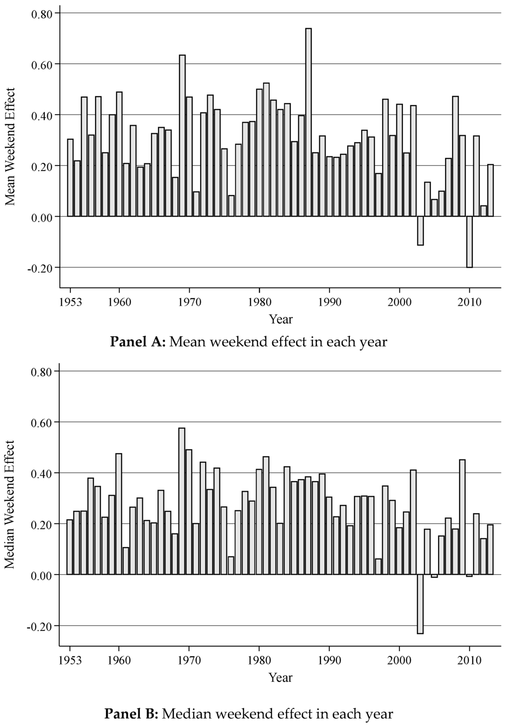To rule out such possibility, Panel B plots the median weekend effect in each year (i.e., median of the 52 weekend effects in each year), and finds that the median weekend effect is positive in 33 out of the most recent 36 years (p-value < 0.000001 using a binomial probability test). While the hypothesis in Kamstra et al. [16] might explain why the mean weekend effect is significant, it is unlikely to explain why the median weekend effect is also significant (since daylight savings adjustments affects only two of the 52 weekends each year). This means that the weekend effect is unlikely to be caused by some rare, but yearly recurring, events.
